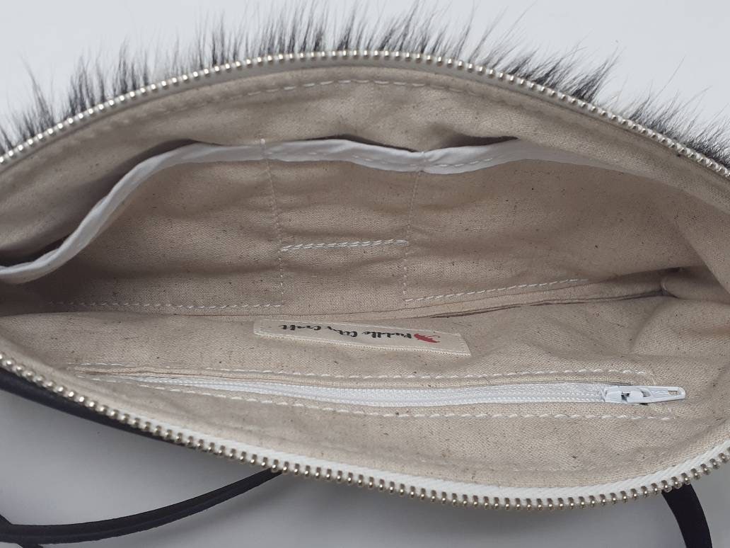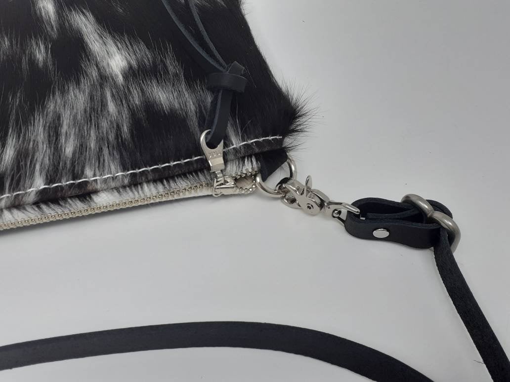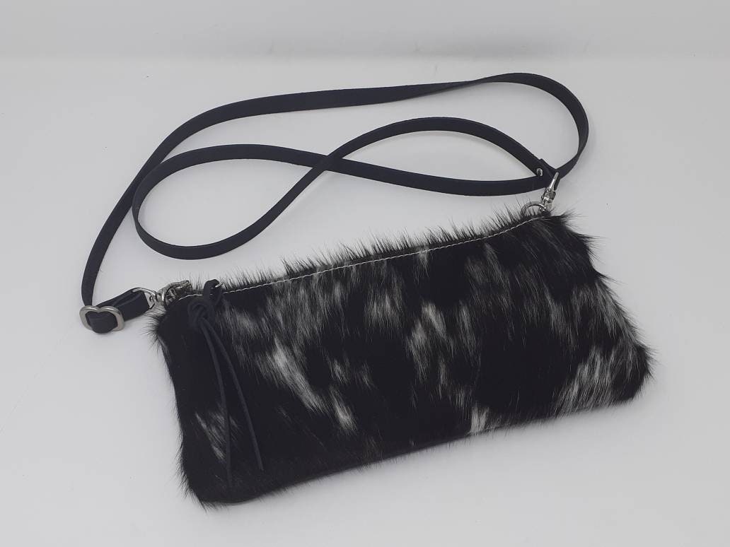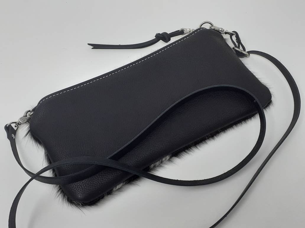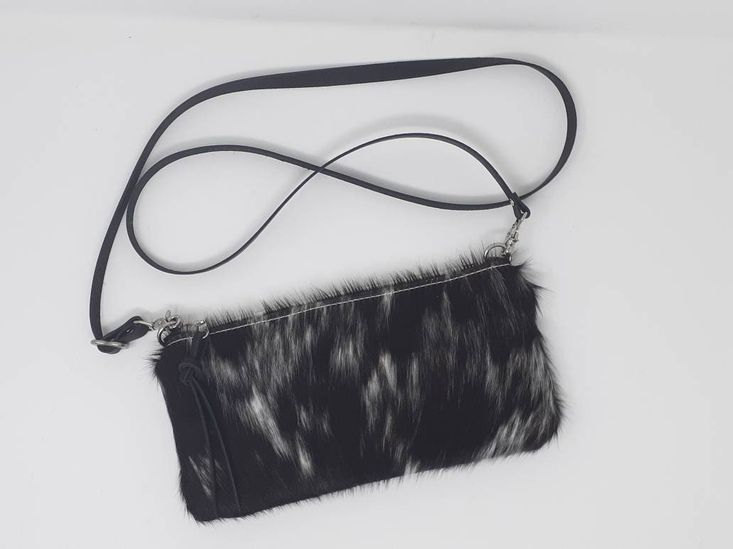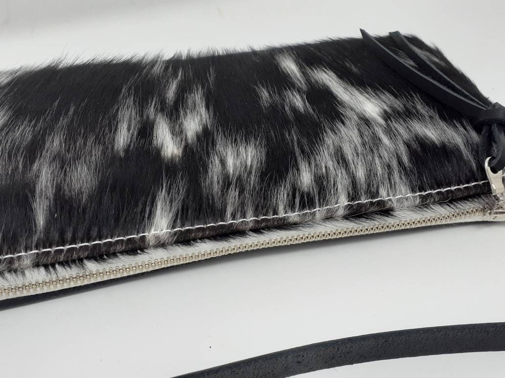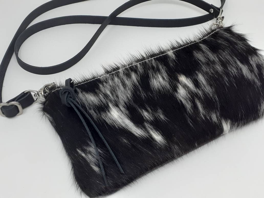 Searching for that perfect gift for a loved one? Or even looking for a new bag for yourself? I am so in love with this dark brown/black and white cutie! Smaller crossbody style purse made with hair on hide leather and black leather back. The perfect size to carry the essentials, with two inner slip pockets for extra storage, as well as a place for Chapstick/lipstick and a zip pocket on the opposite side for even more storage.