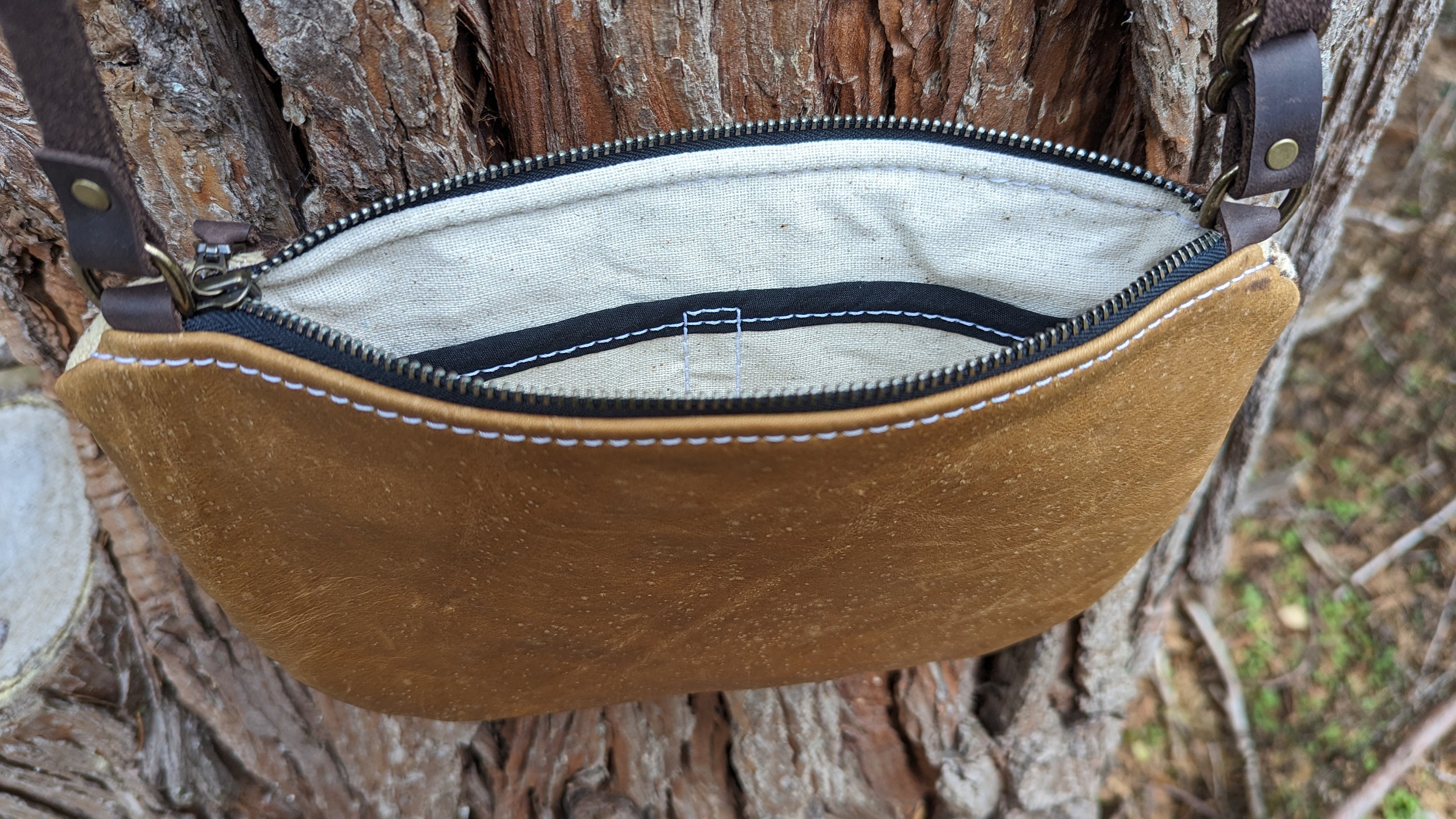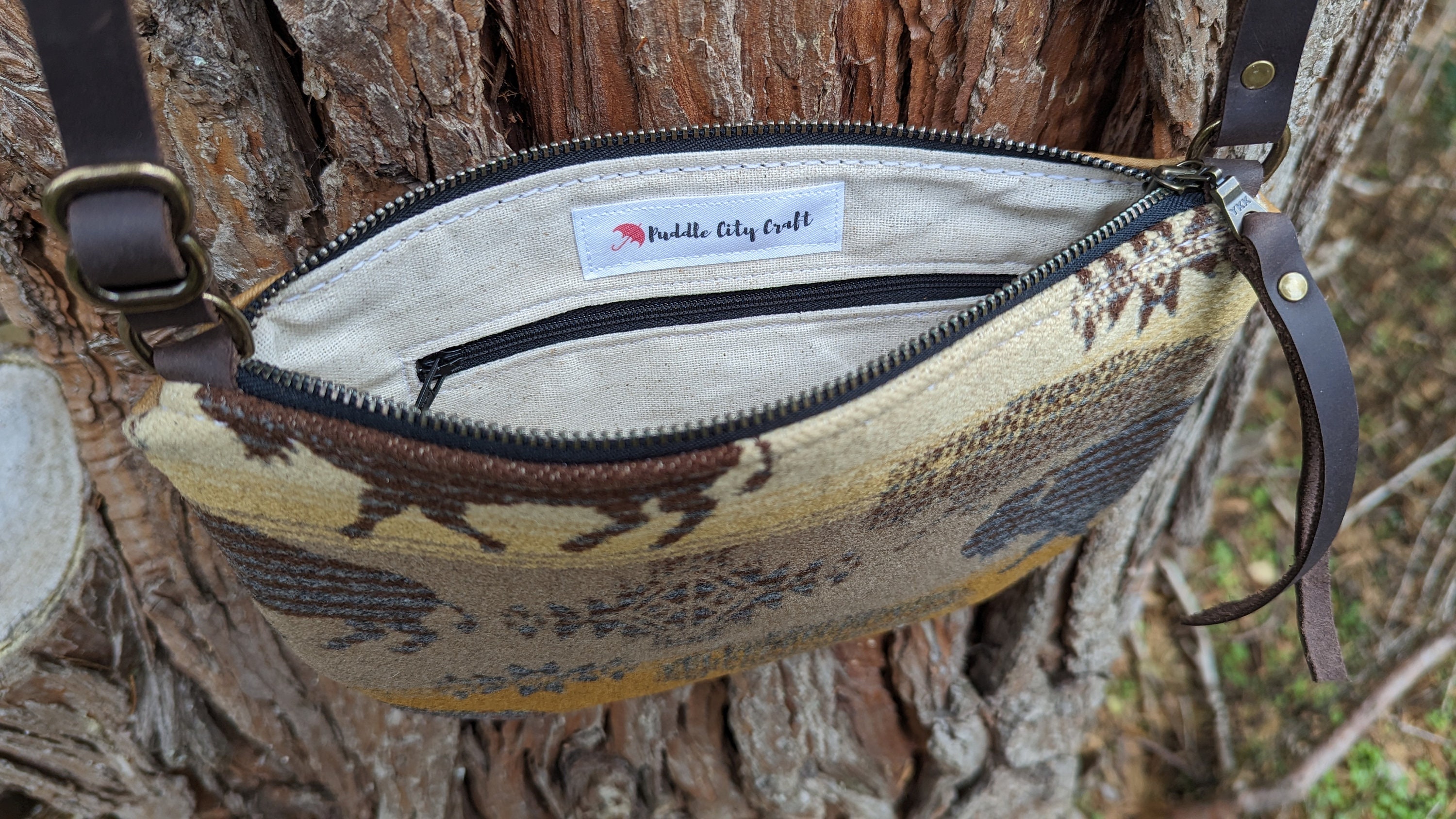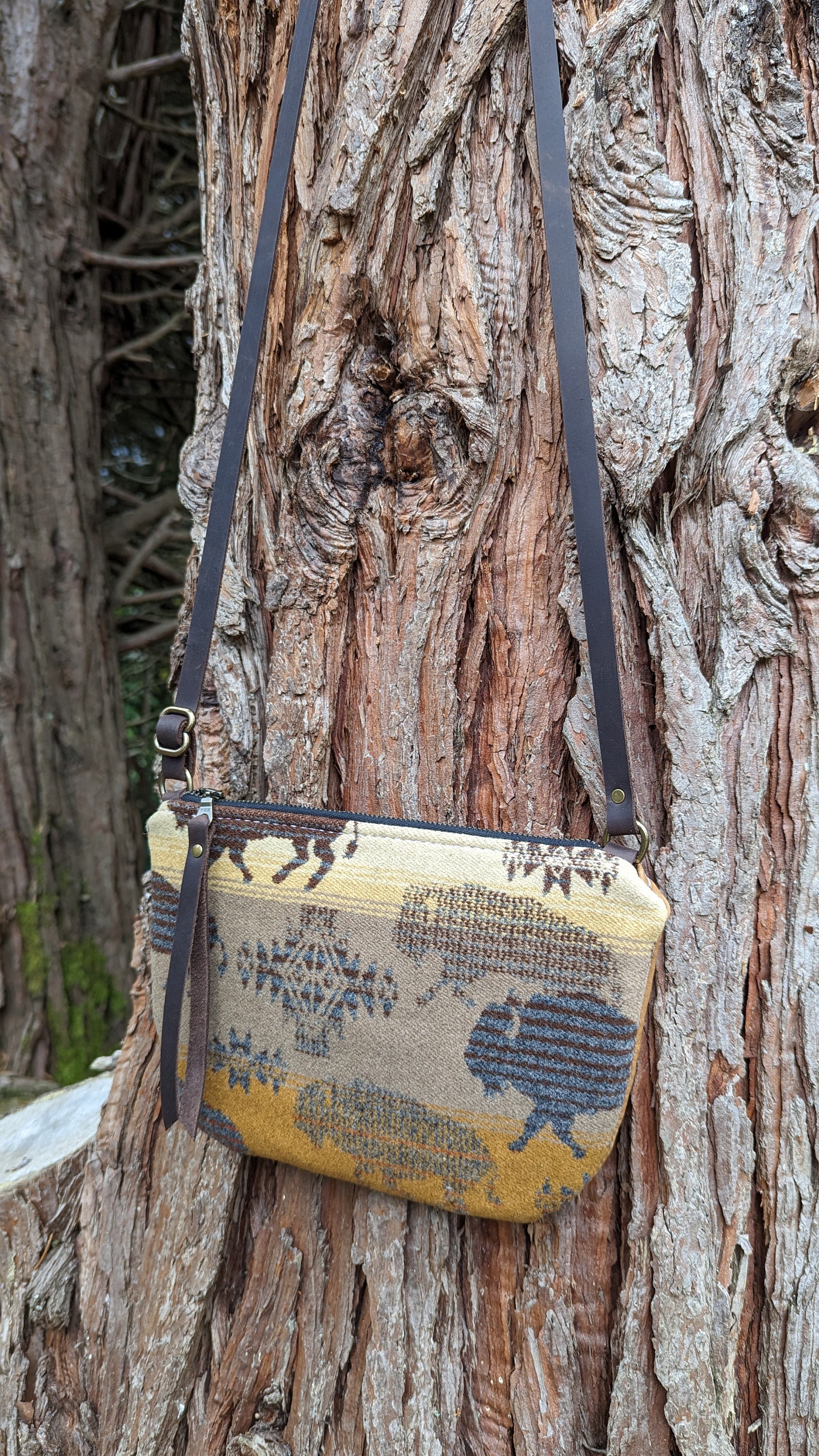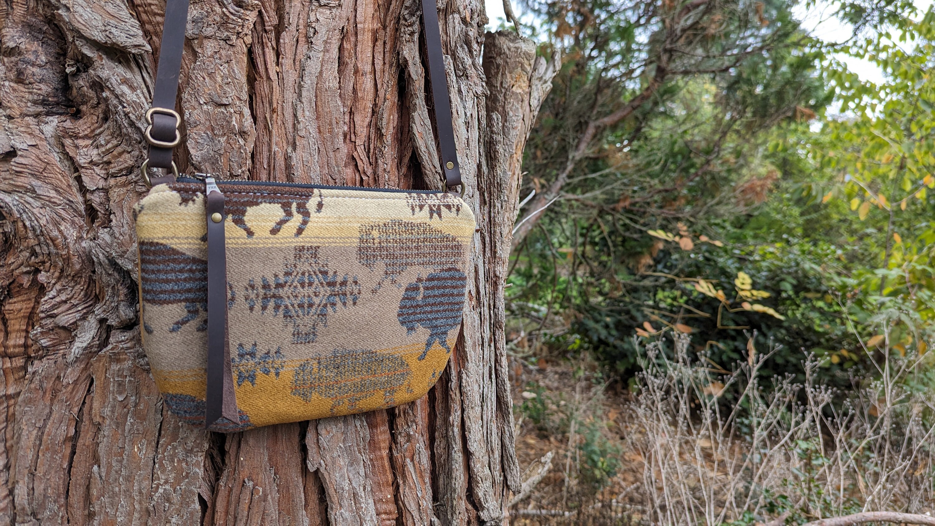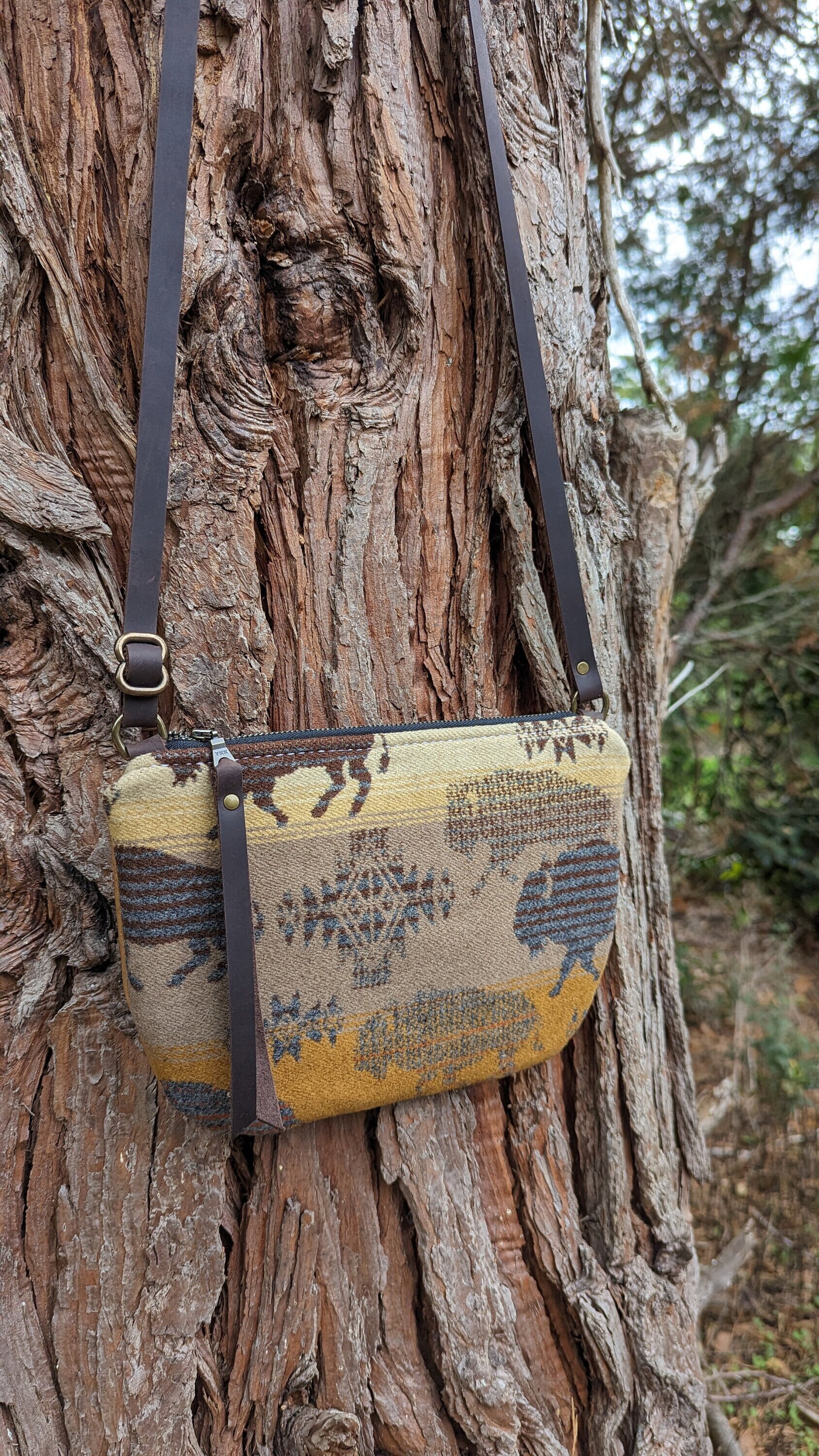 This is a fun little crossbody purse with an adjustable strap made with Pendleton ® heavy weight jacquard wool and leather. Inside there is a natural colored cotton lining with a zip pocket on one side and two slip pockets on the other for extra storage. This bag is lined to hold it's shape. This is the perfect size for daily use, it will fit all of your essentials. Use this bag as an everyday purse or for the night out or festivals!