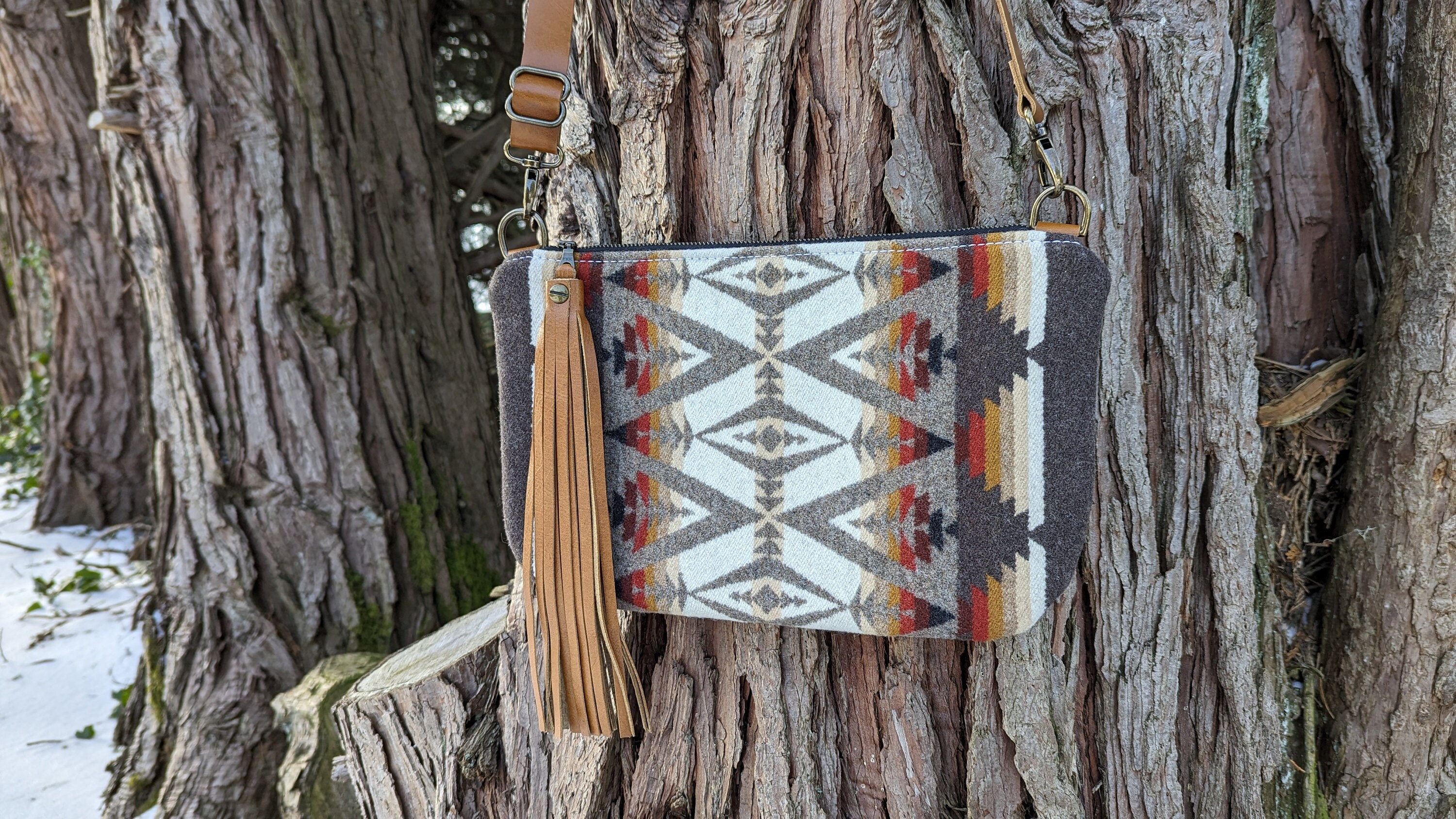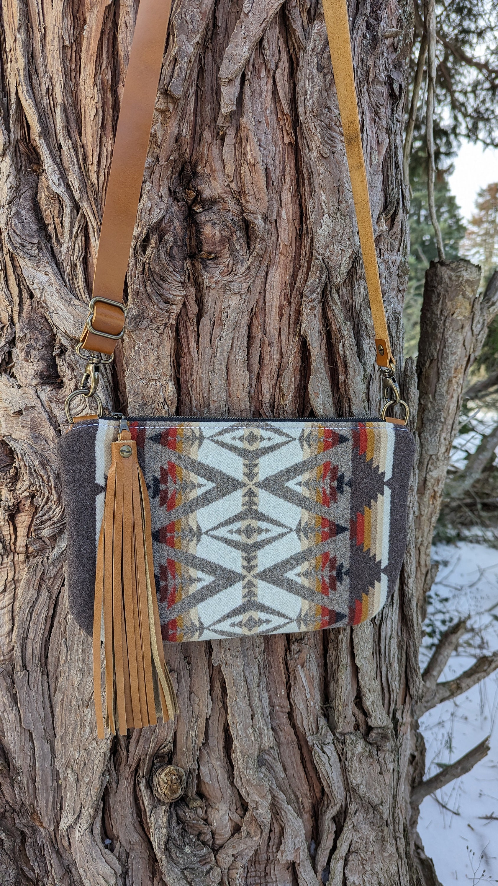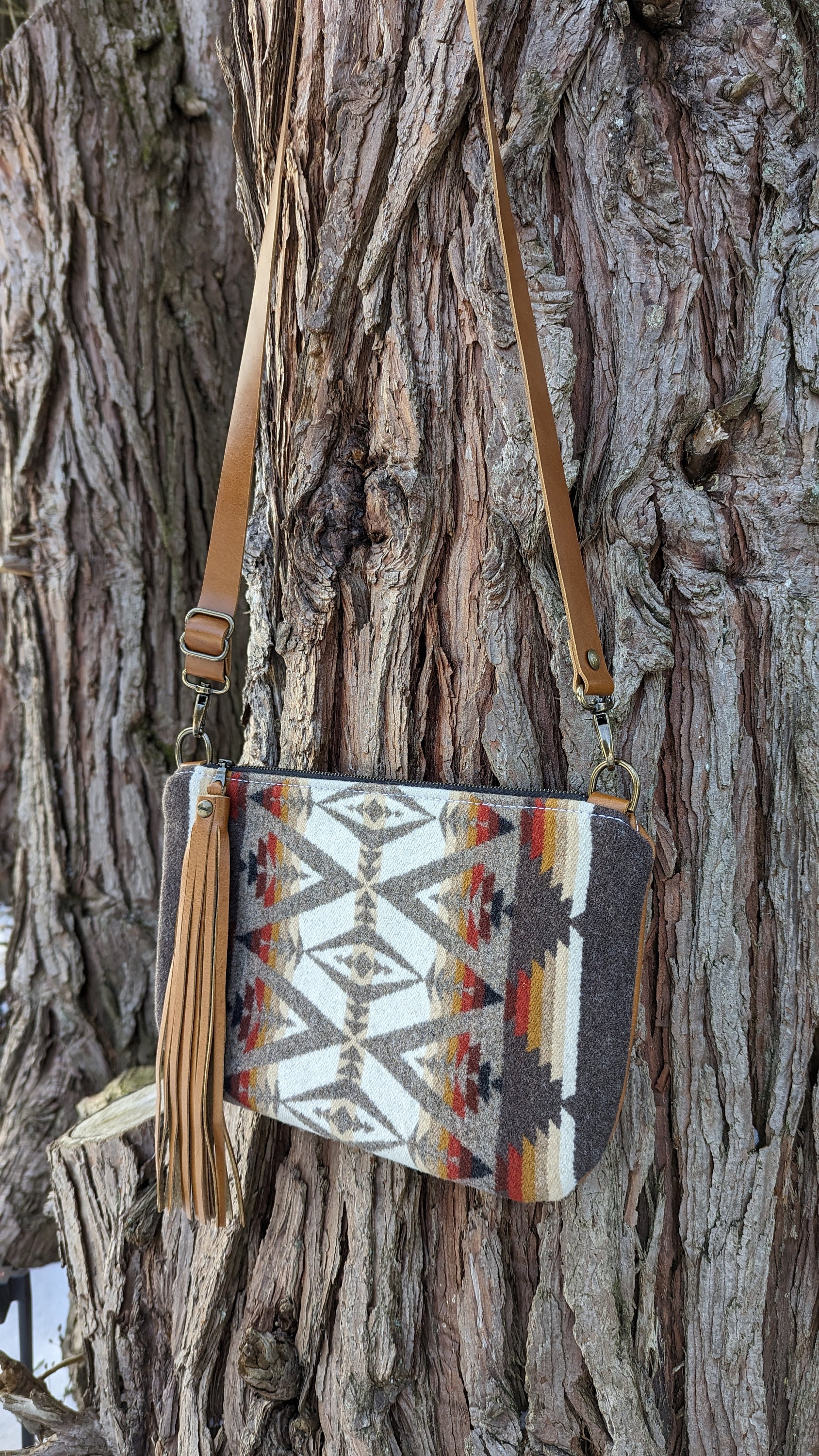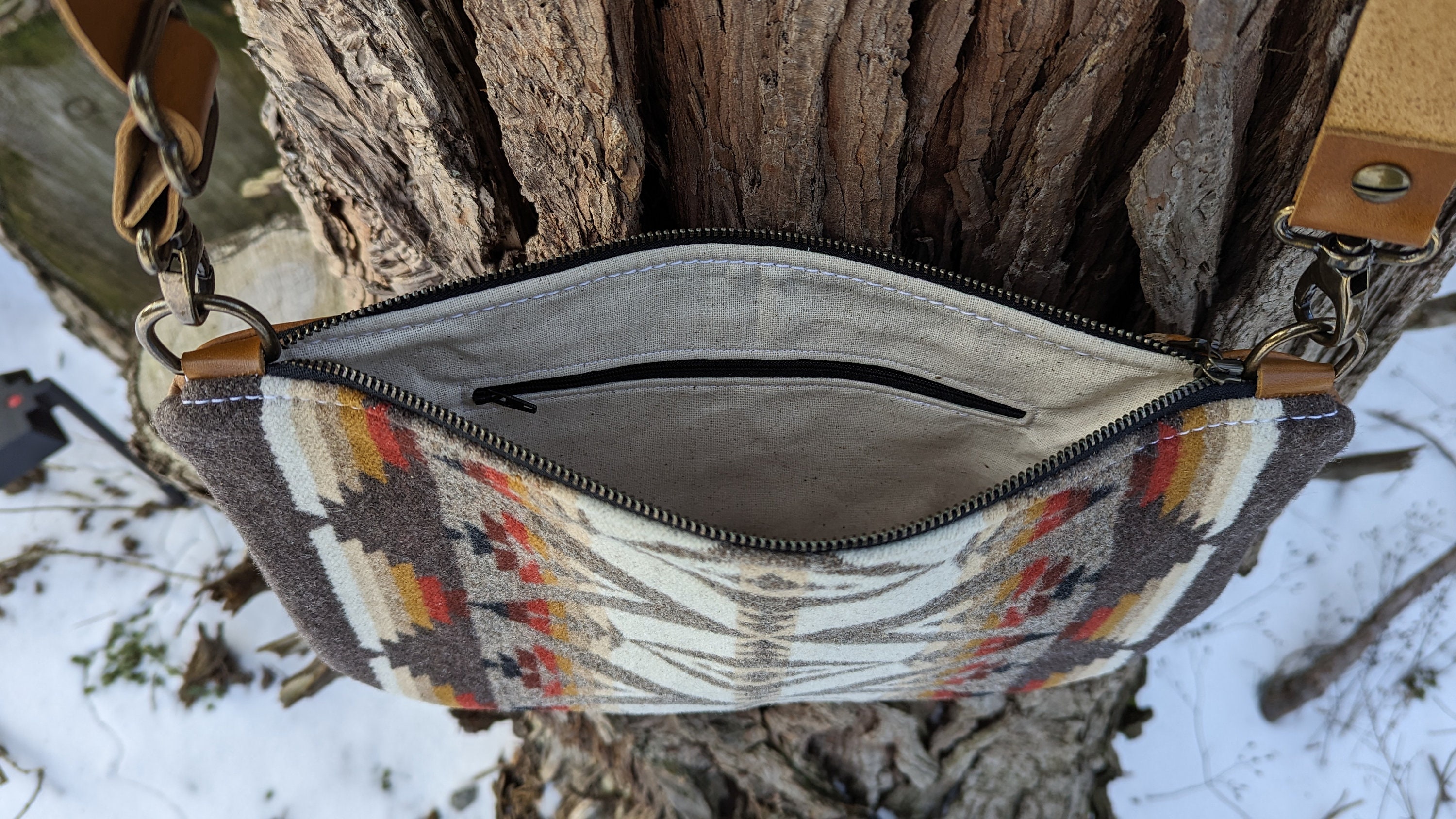This is a fun medium sized crossbody purse with an adjustable strap made with Pendleton ® heavy weight jacquard wool and leather. Inside there is a natural colored cotton lining with a zip pocket on one side and two slip pockets on the other for extra storage. This bag is lined to hold it's shape. This is the perfect size for daily use, it will fit all of your essentials and then some.