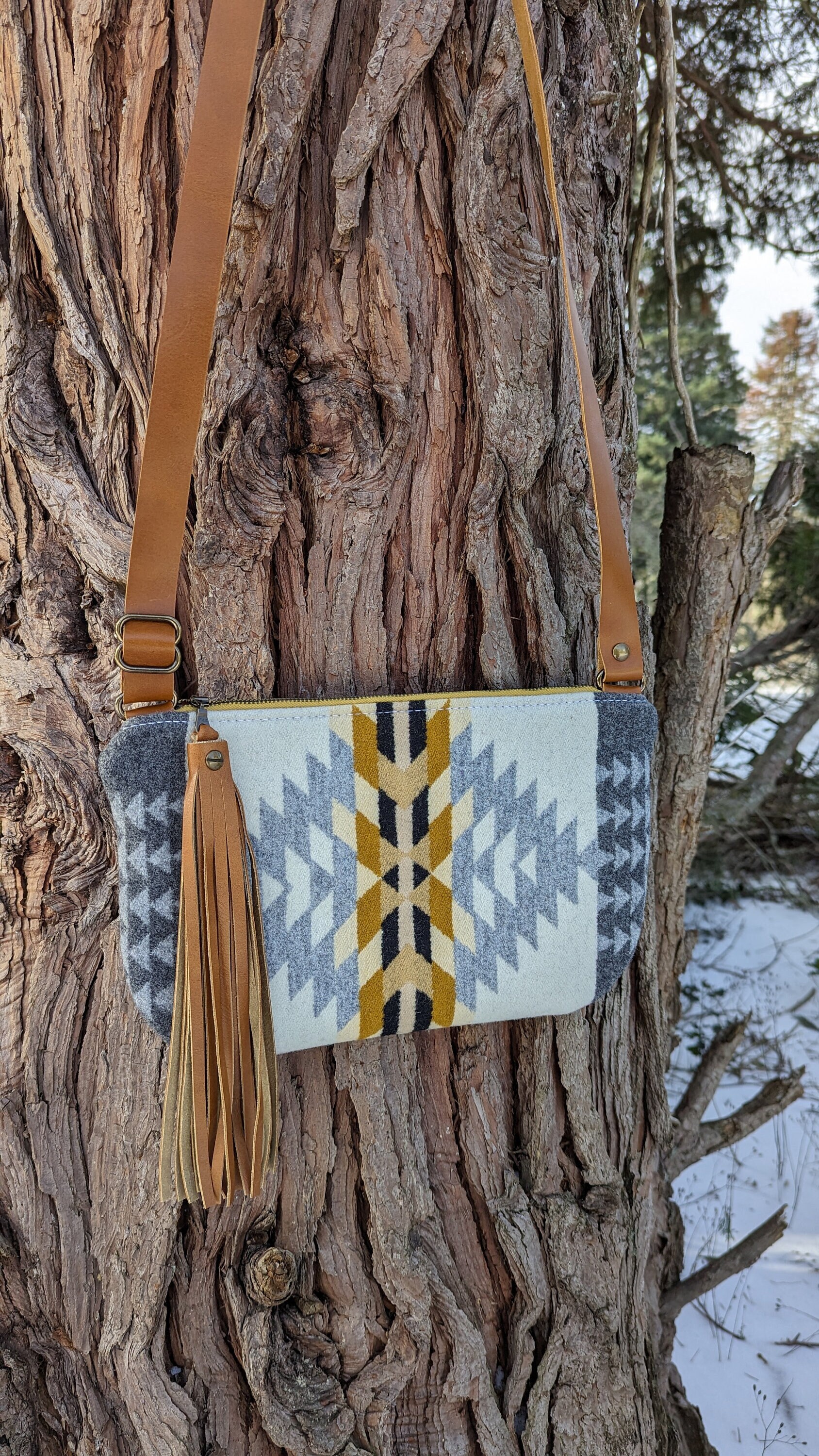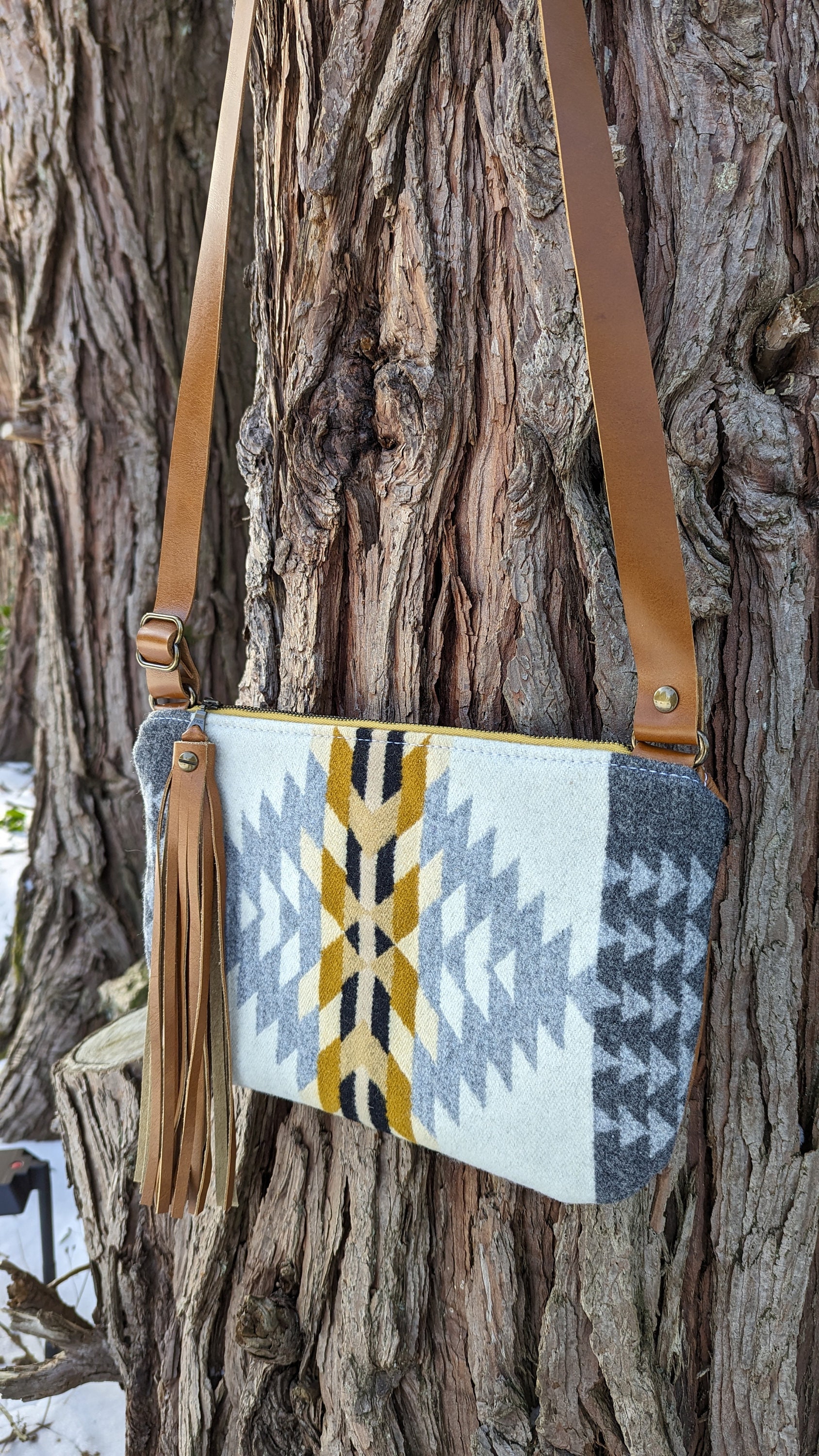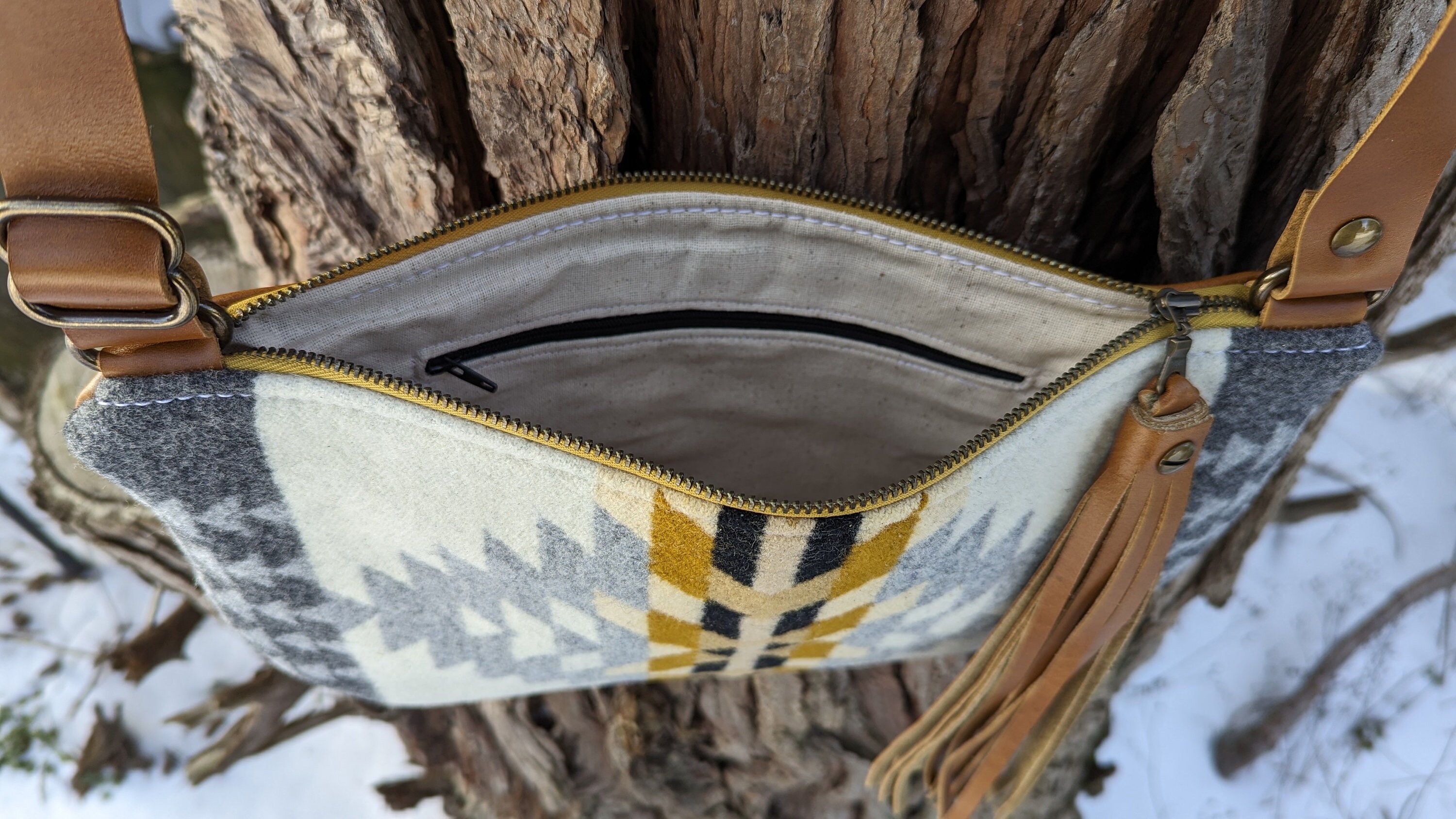 This is a fun medium sized crossbody purse with an adjustable strap made with Pendleton ® heavy weight jacquard wool and leather. Inside there is a natural colored cotton lining with a zip pocket on one side and two slip pockets on the other for extra storage. This bag is lined to hold it's shape. This is the perfect size for daily use, it will fit all of your essentials and then some.