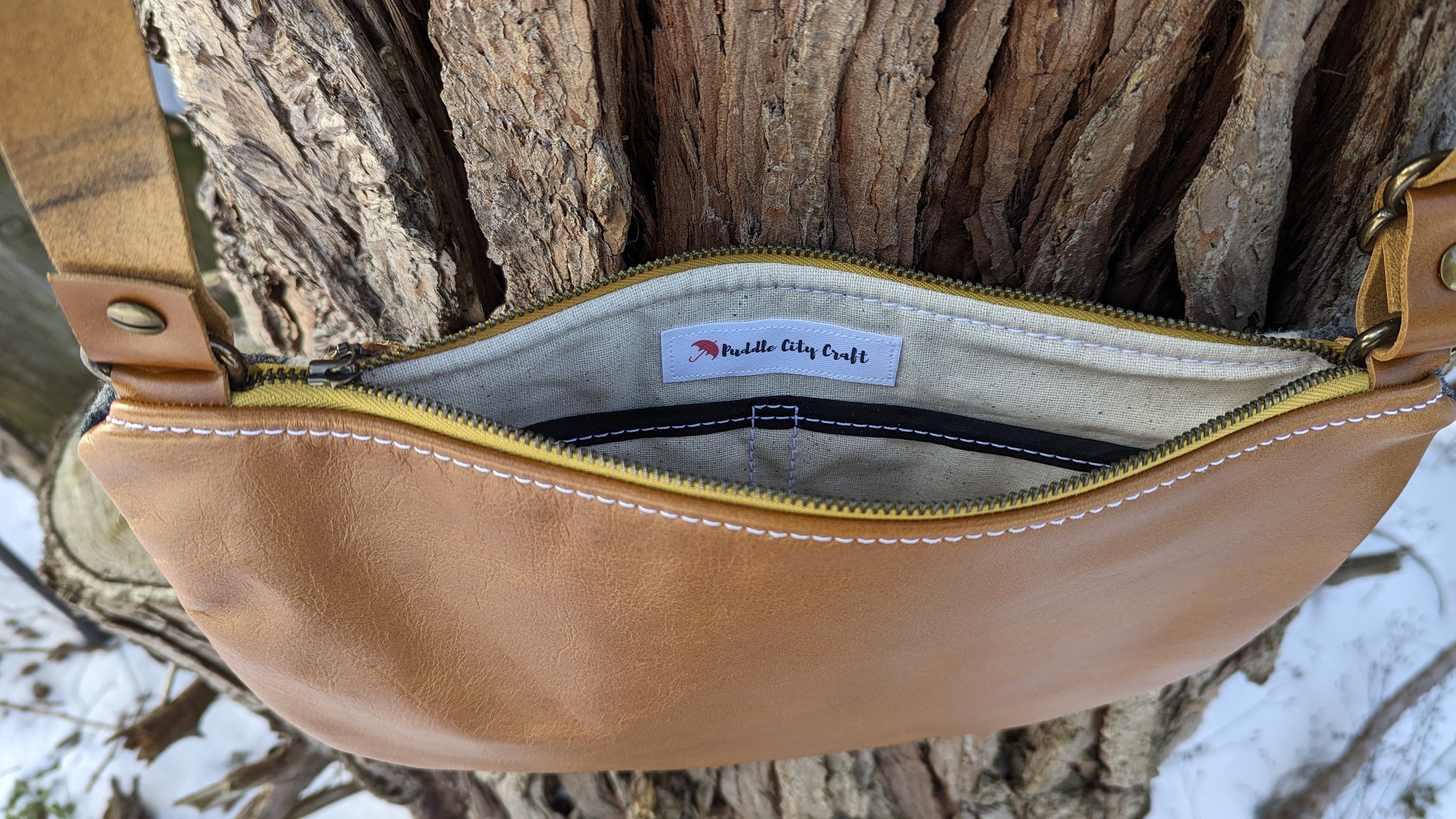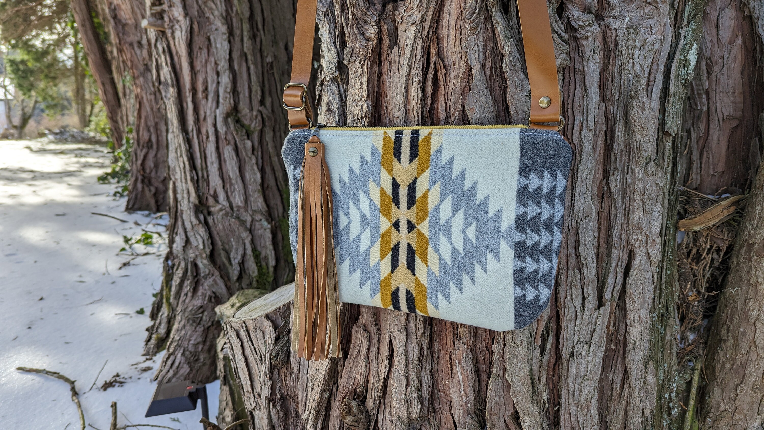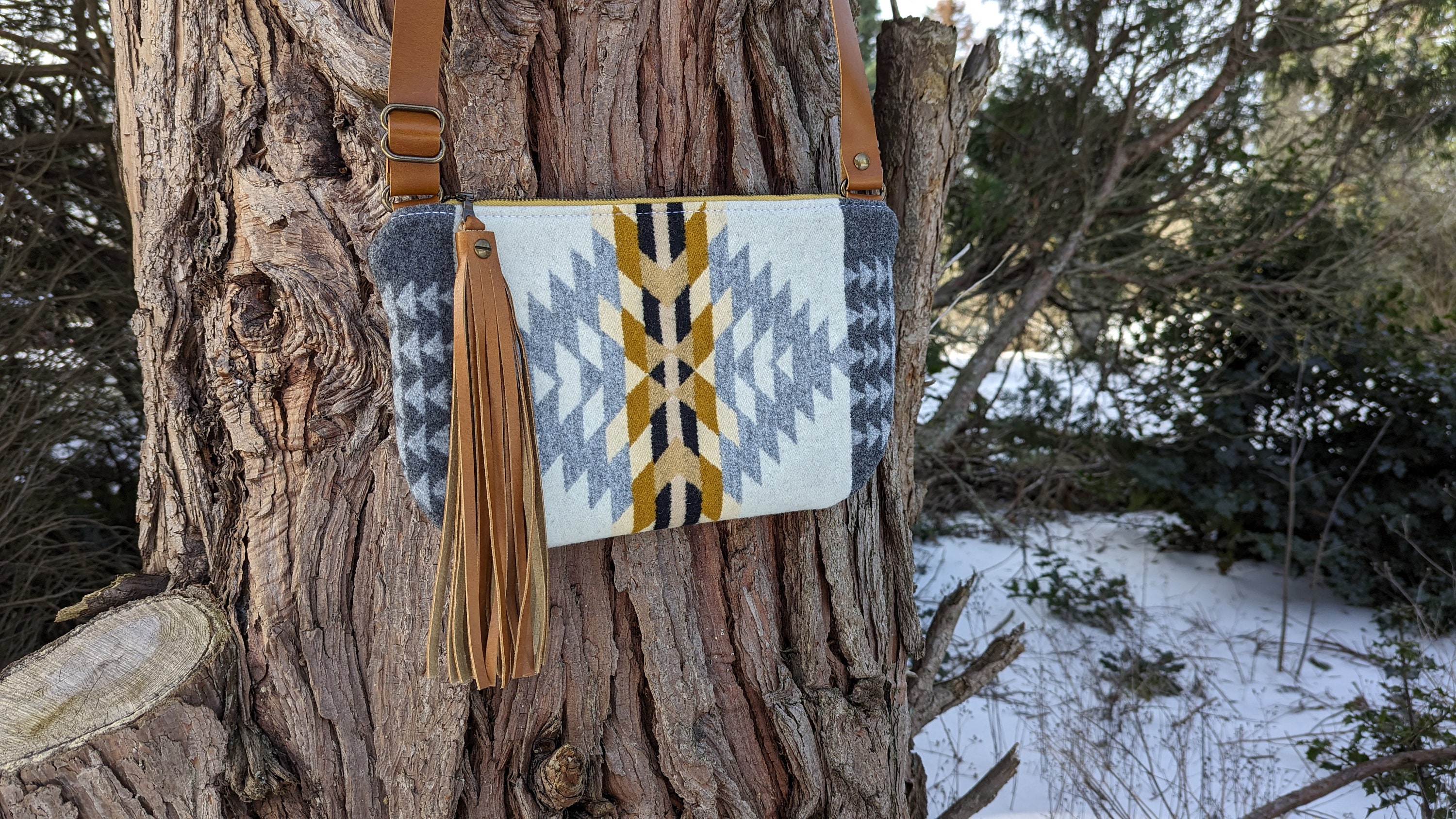 This is a fun medium sized crossbody purse with an adjustable strap made with Pendleton ® heavy weight jacquard wool and leather. Inside there is a natural colored cotton lining with a zip pocket on one side and two slip pockets on the other for extra storage. This bag is lined to hold it's shape. This is the perfect size for daily use, it will fit all of your essentials and then some.