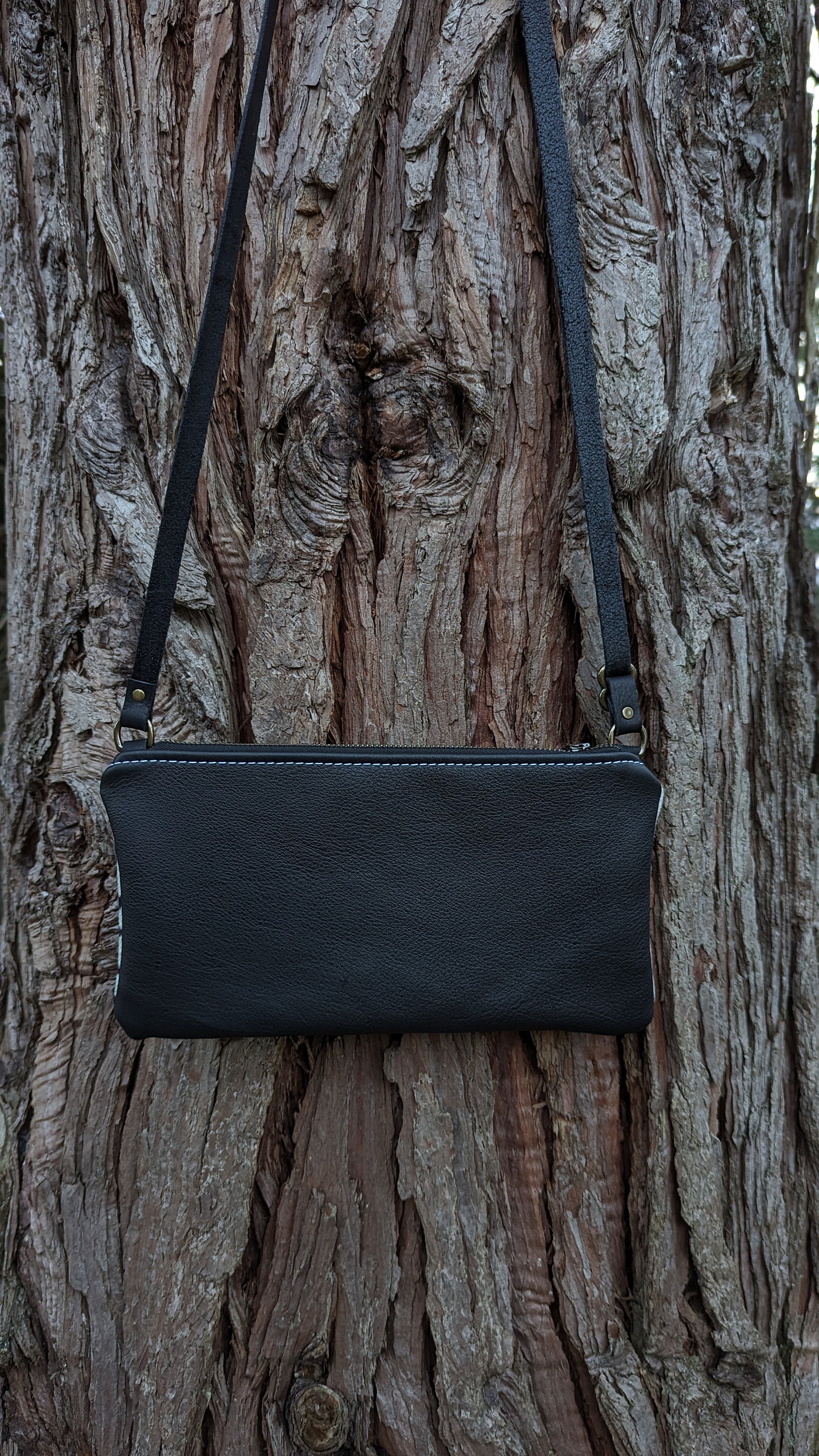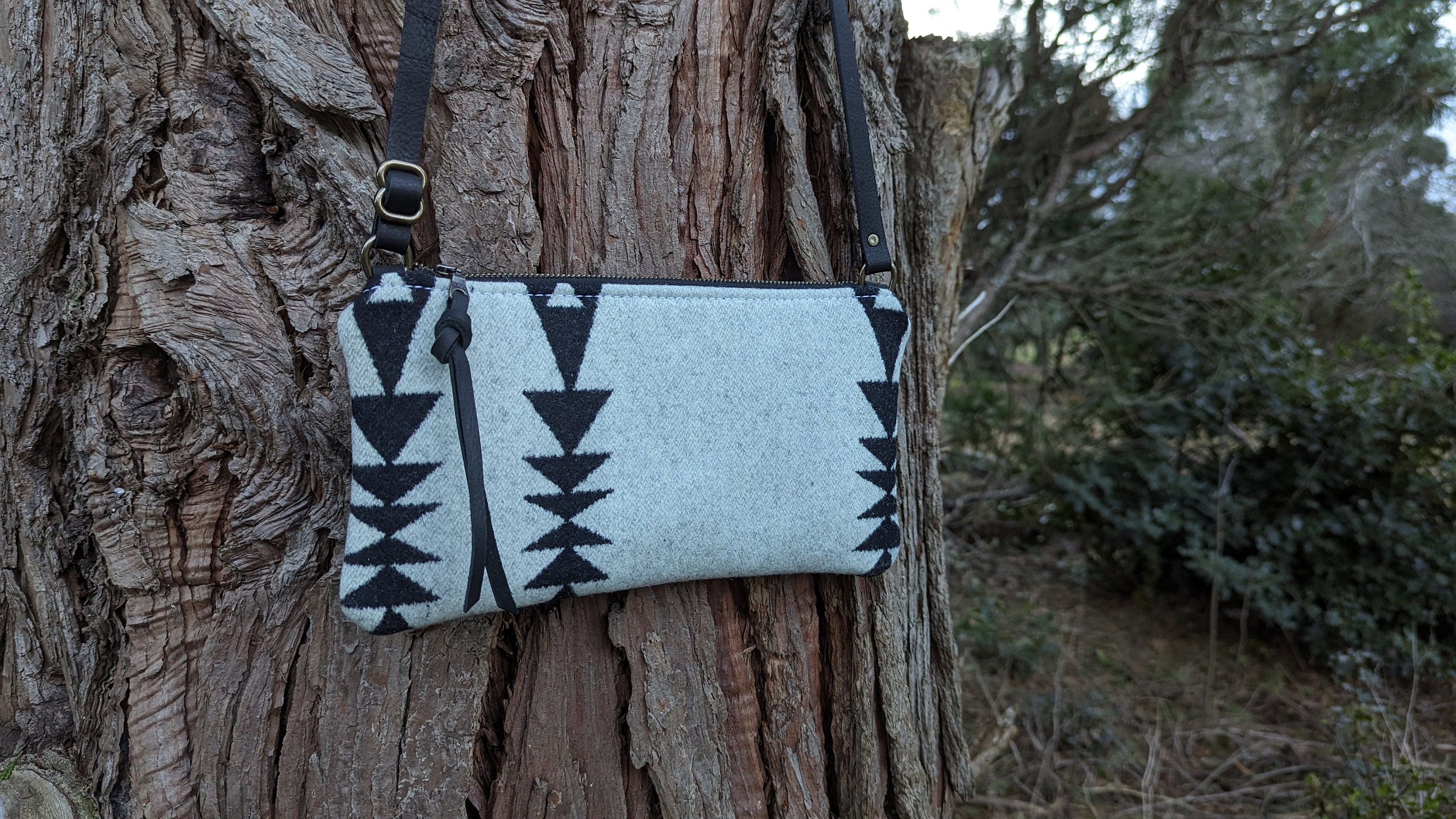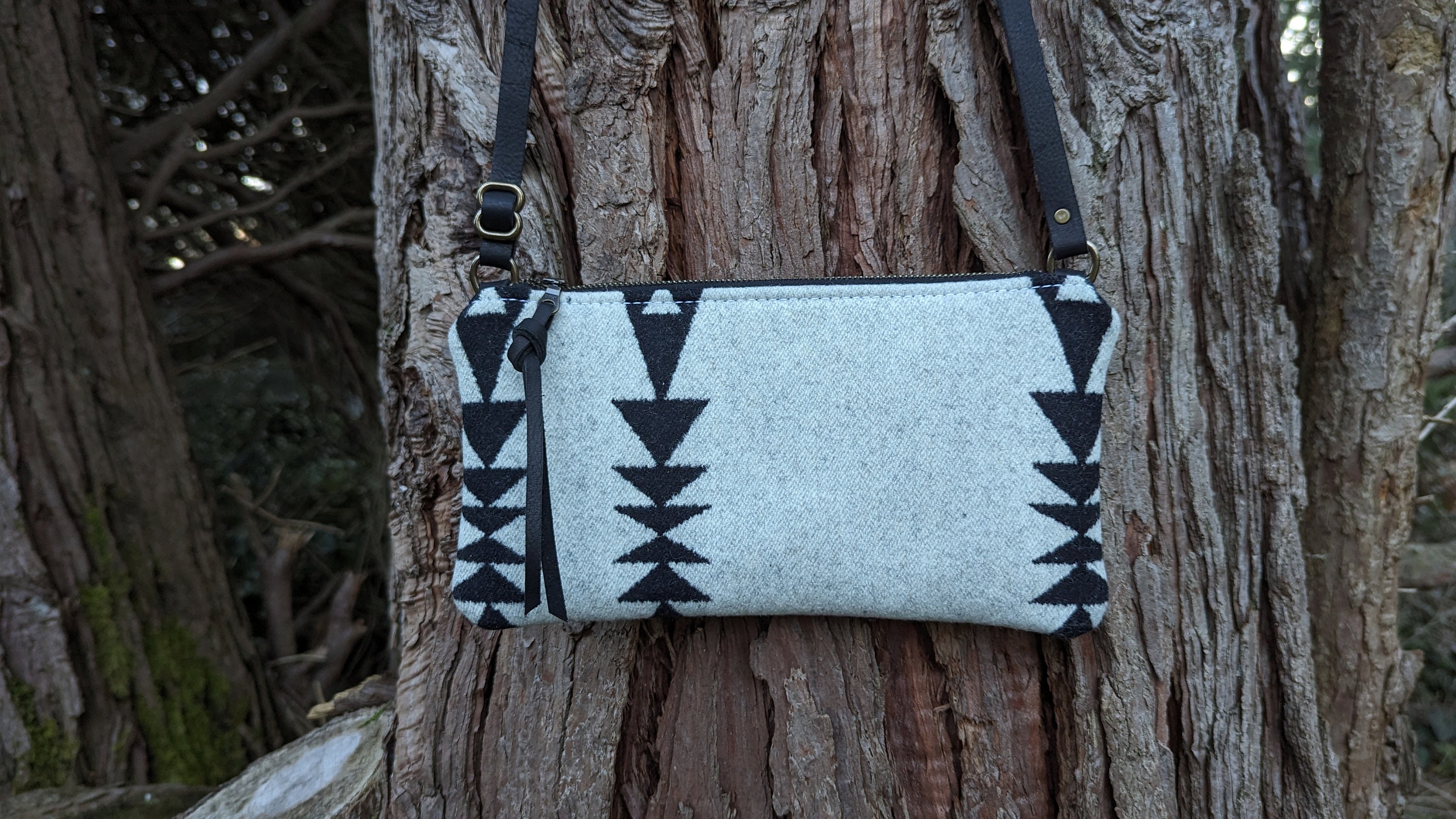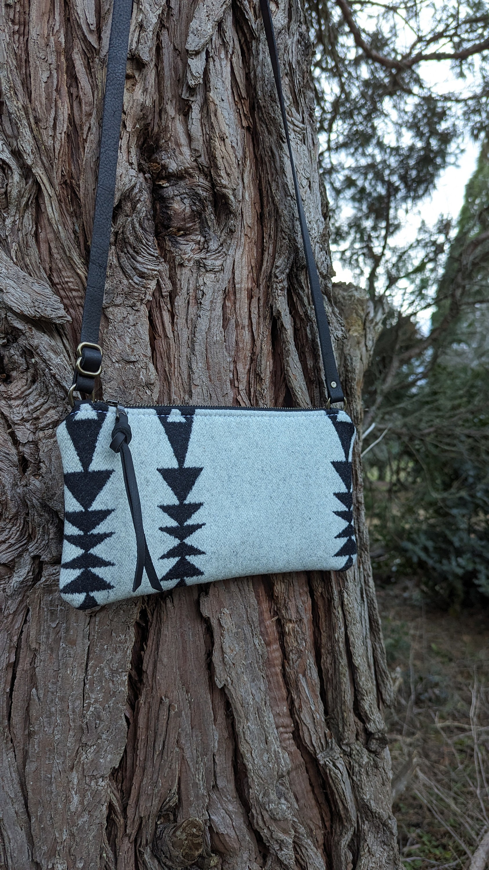 Smaller crossbody style purse made with black and white Pendleton® wool and a black leather back. The perfect size to carry the essentials, with two inner slip pockets for extra storage, as well as a zipper pocket on the opposite side for even more storage.