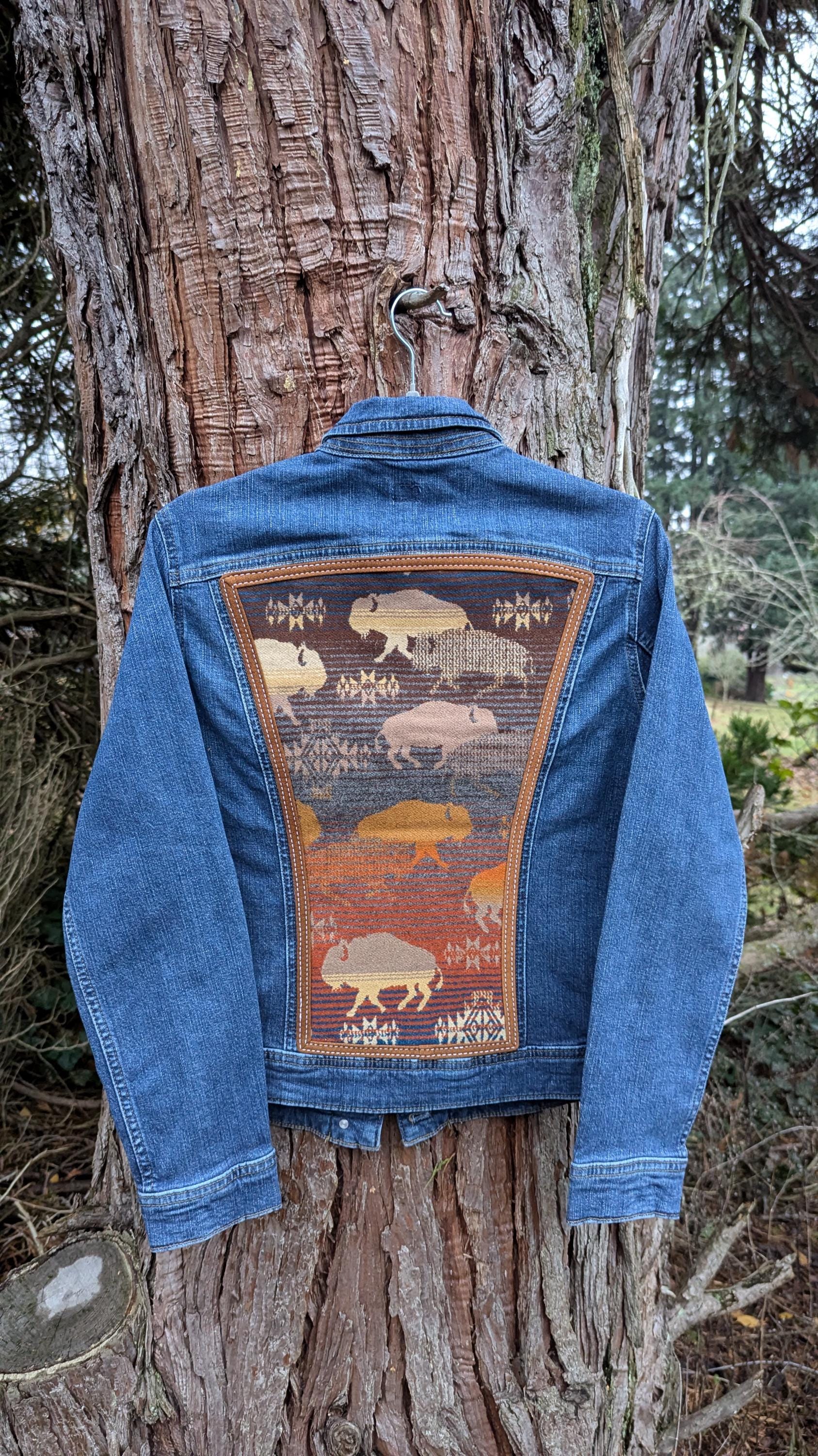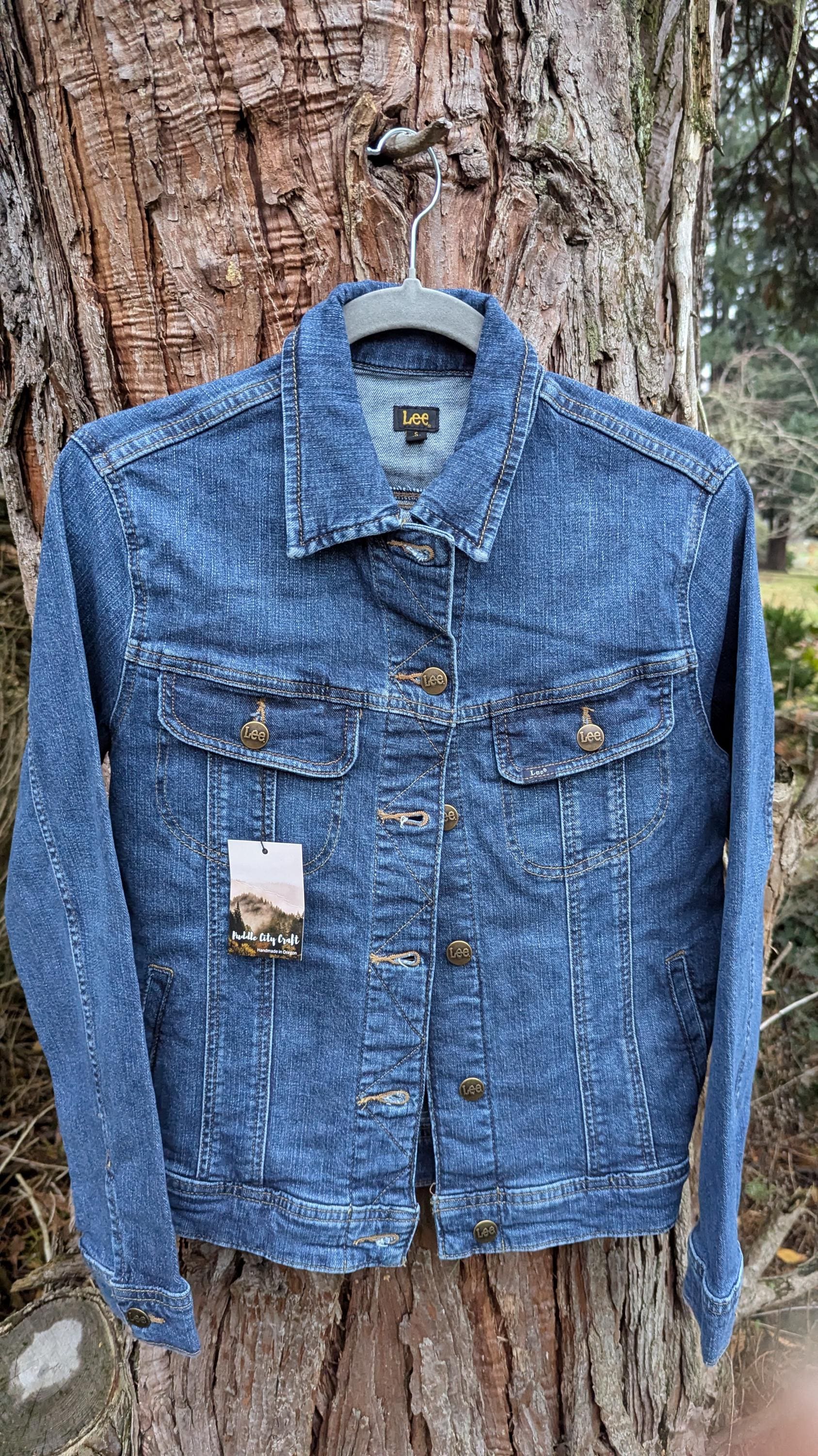 Small size (new Lee Rider brand jean jacket base) jean jacket with Pendleton® wool insert on front and back. Denim on jacket is a regular blue wash color.
