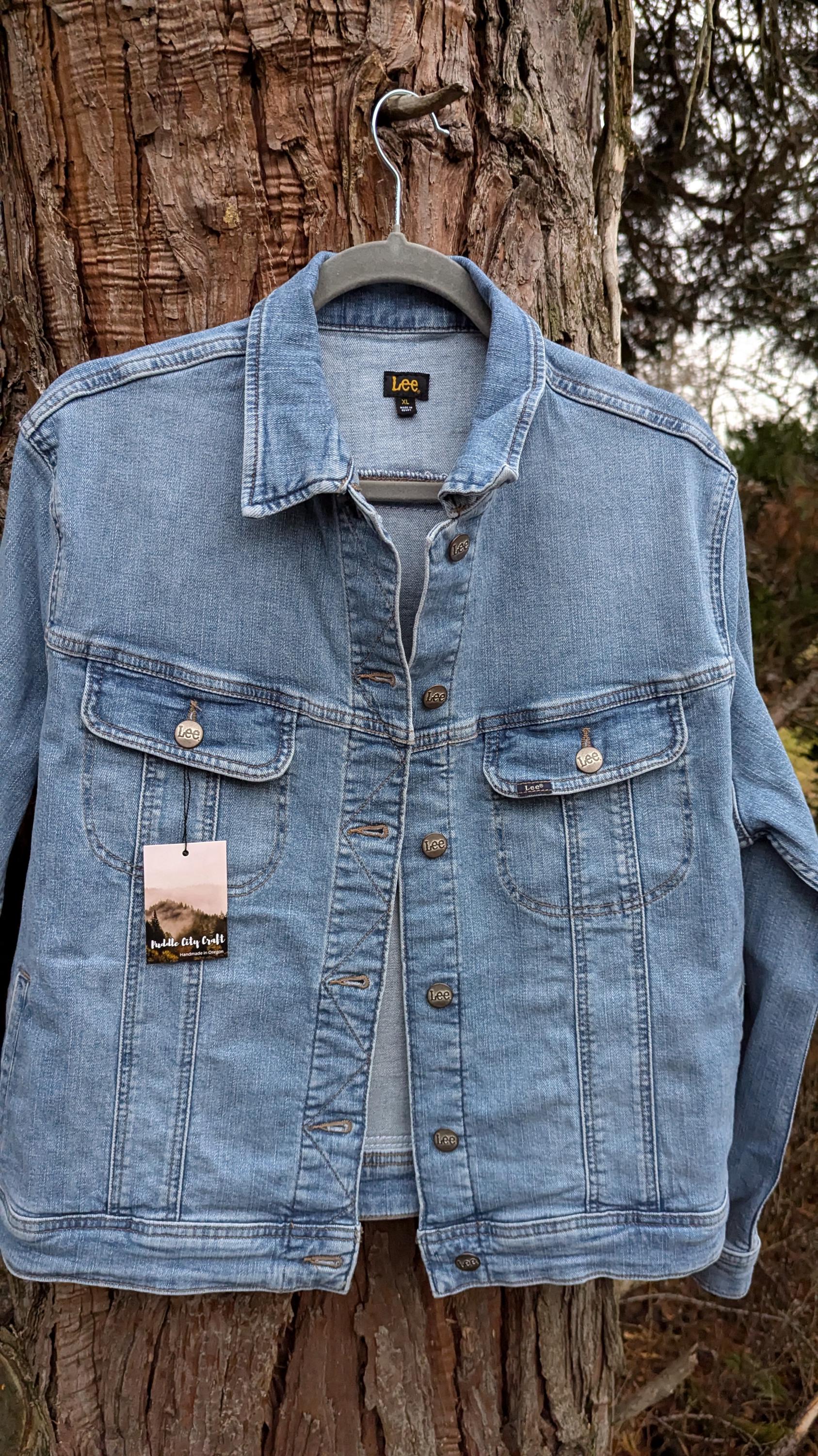 X-Large size (new Lee Rider brand jean jacket base) jean jacket with Pendleton® wool insert on front and back. Denim on jacket is a light blue wash color.