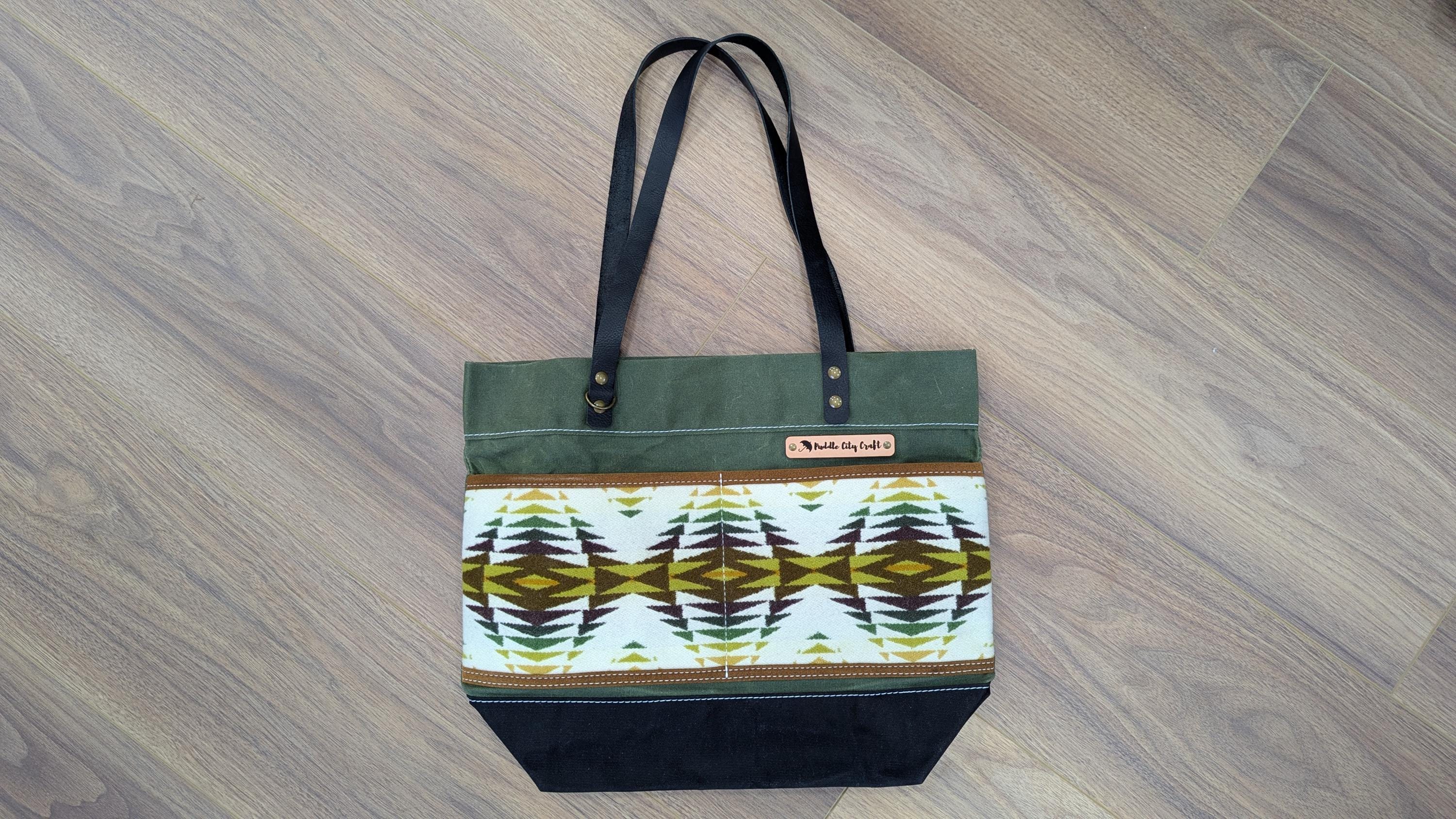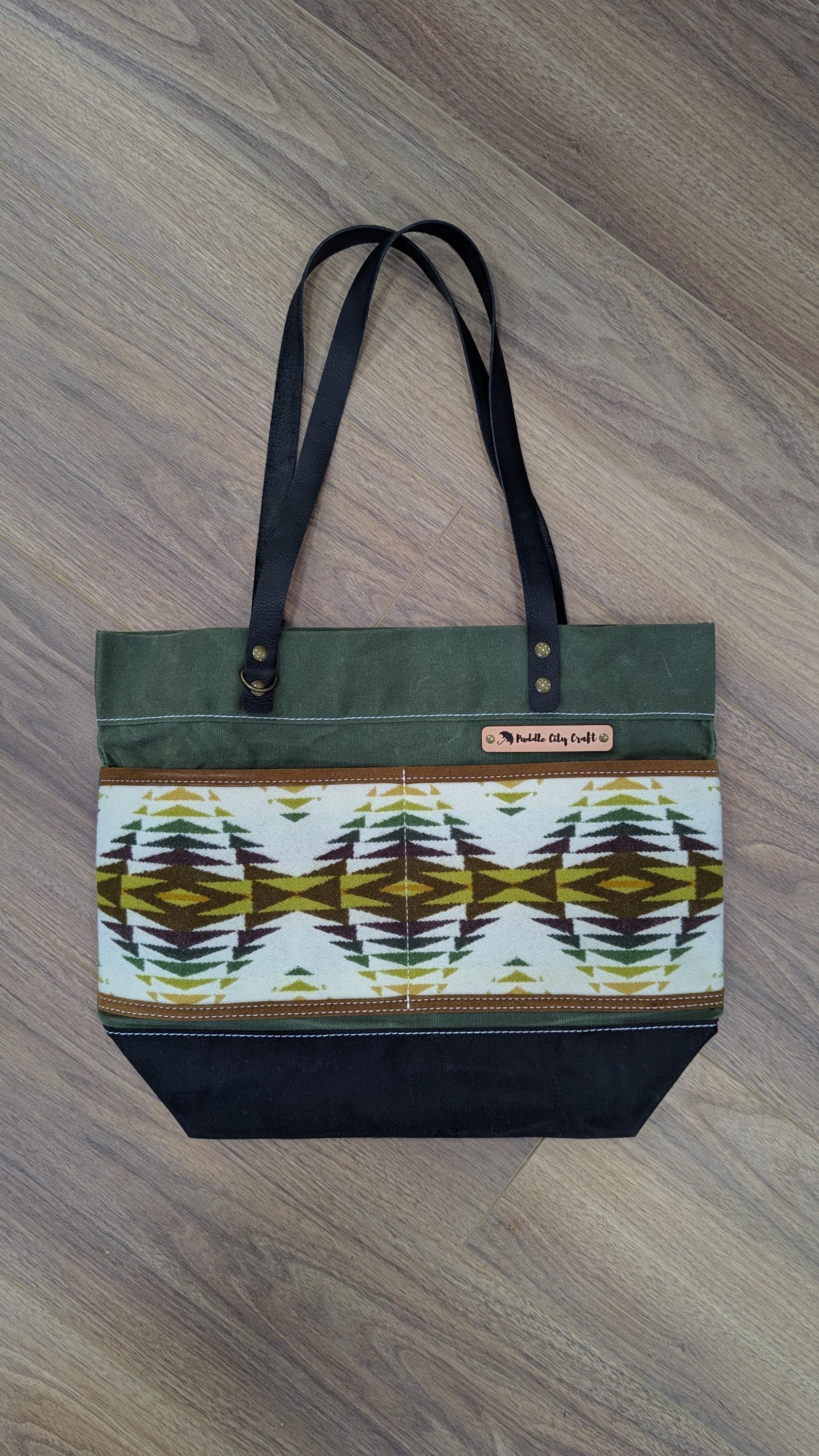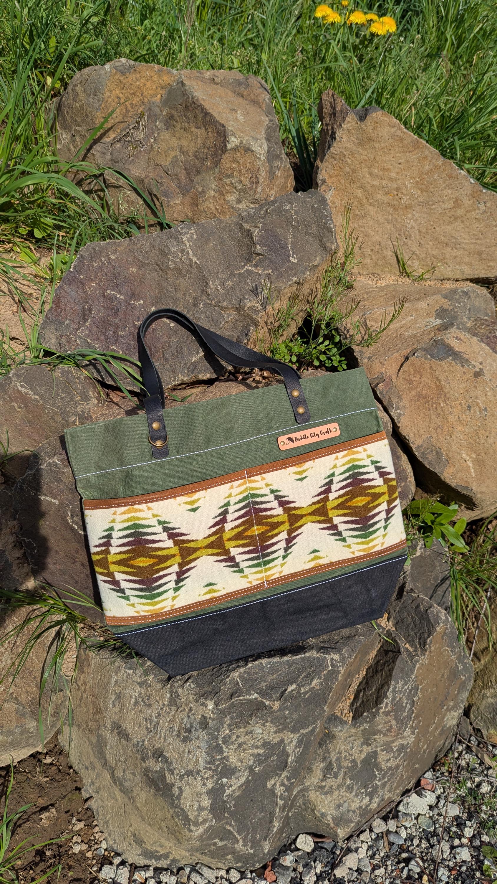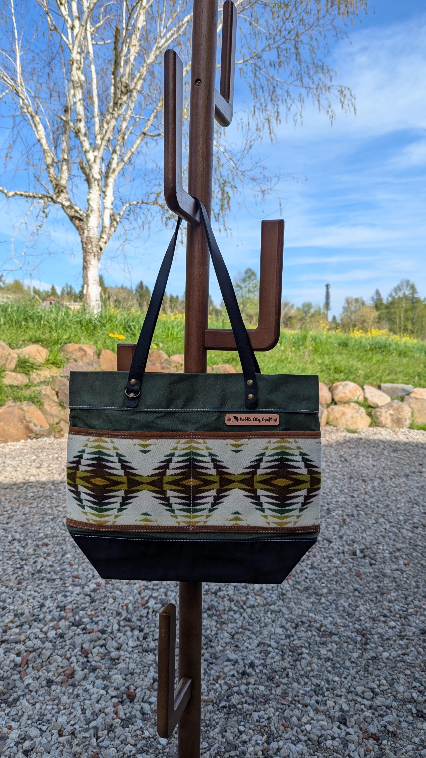 Everyday tote made with waxed canvas and Pendleton wool ®. Front has two slip pockets and a D-ring to clip on your keys or other essentials. Colored waxed canvas body with black base and contrasting Pendleton wool® front pocket.