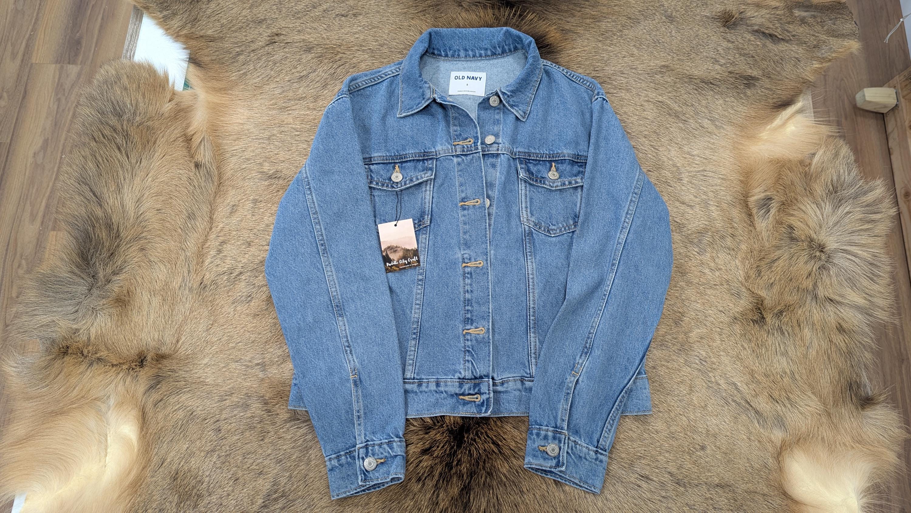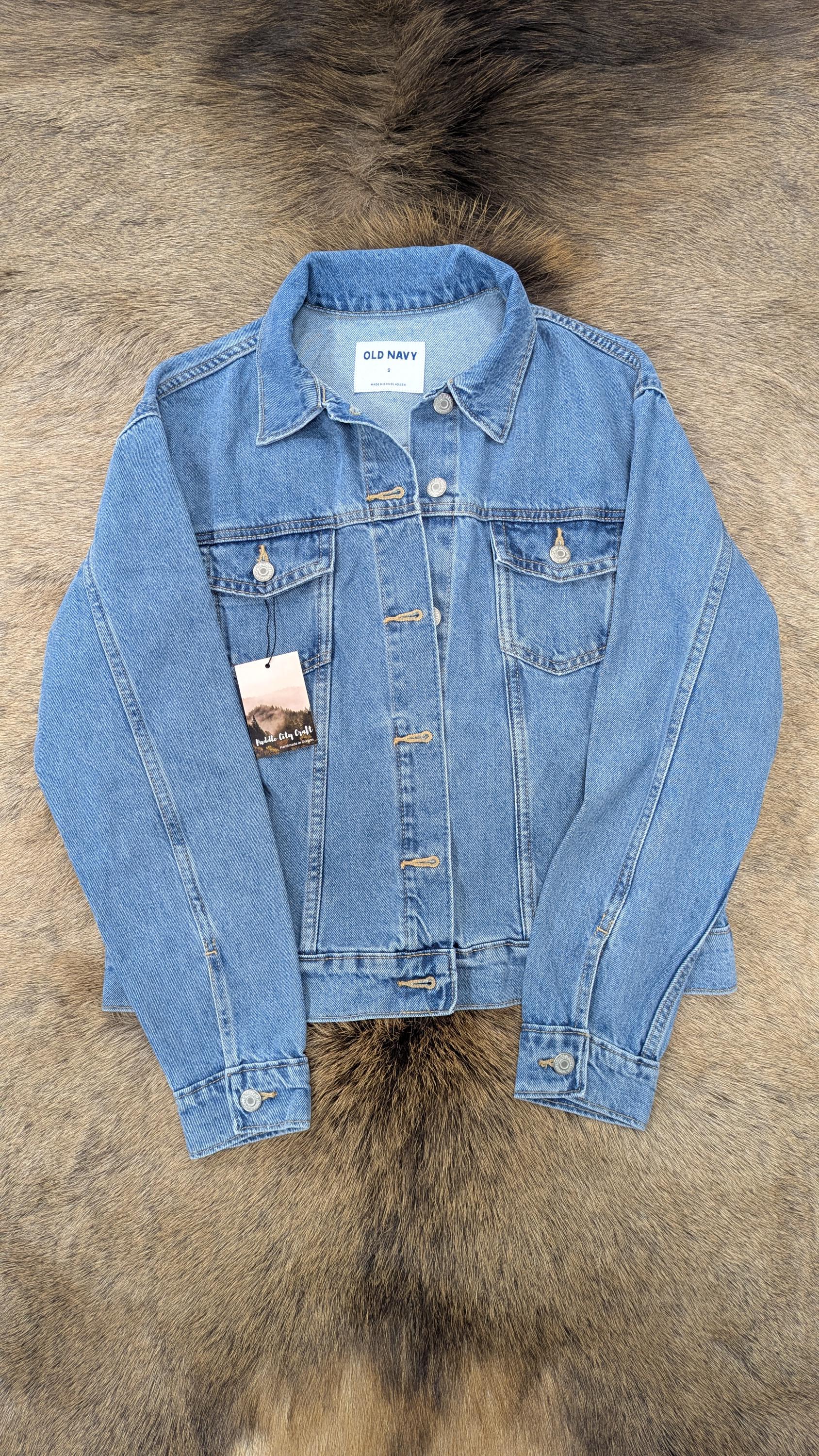 Small size (new Old Navy brand jean jacket base) jean jacket with Pendleton® wool insert on back. Denim on jacket is a light blue wash color.