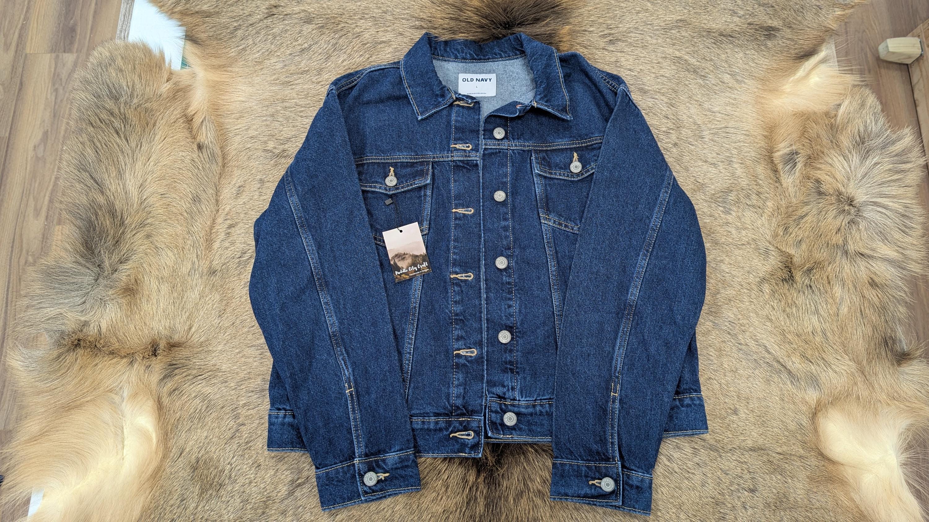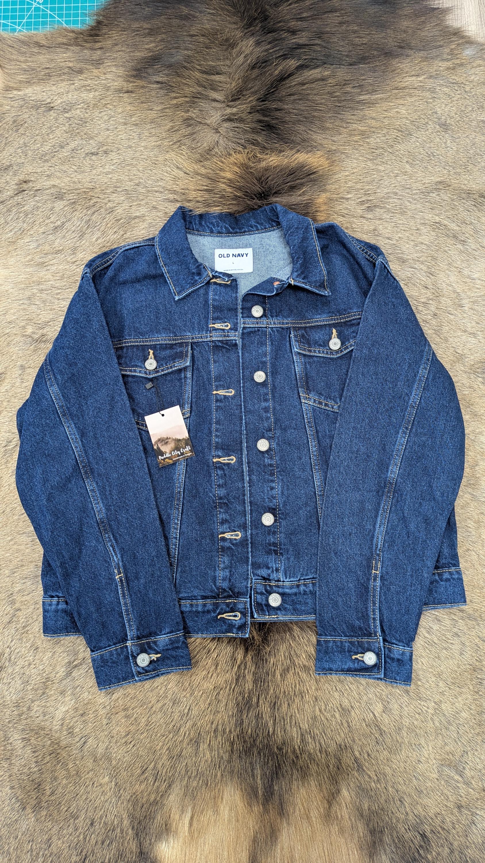 Large size (new Old Navy brand jean jacket base) jean jacket with Pendleton® wool insert on back. Denim on jacket is a dark blue wash color.