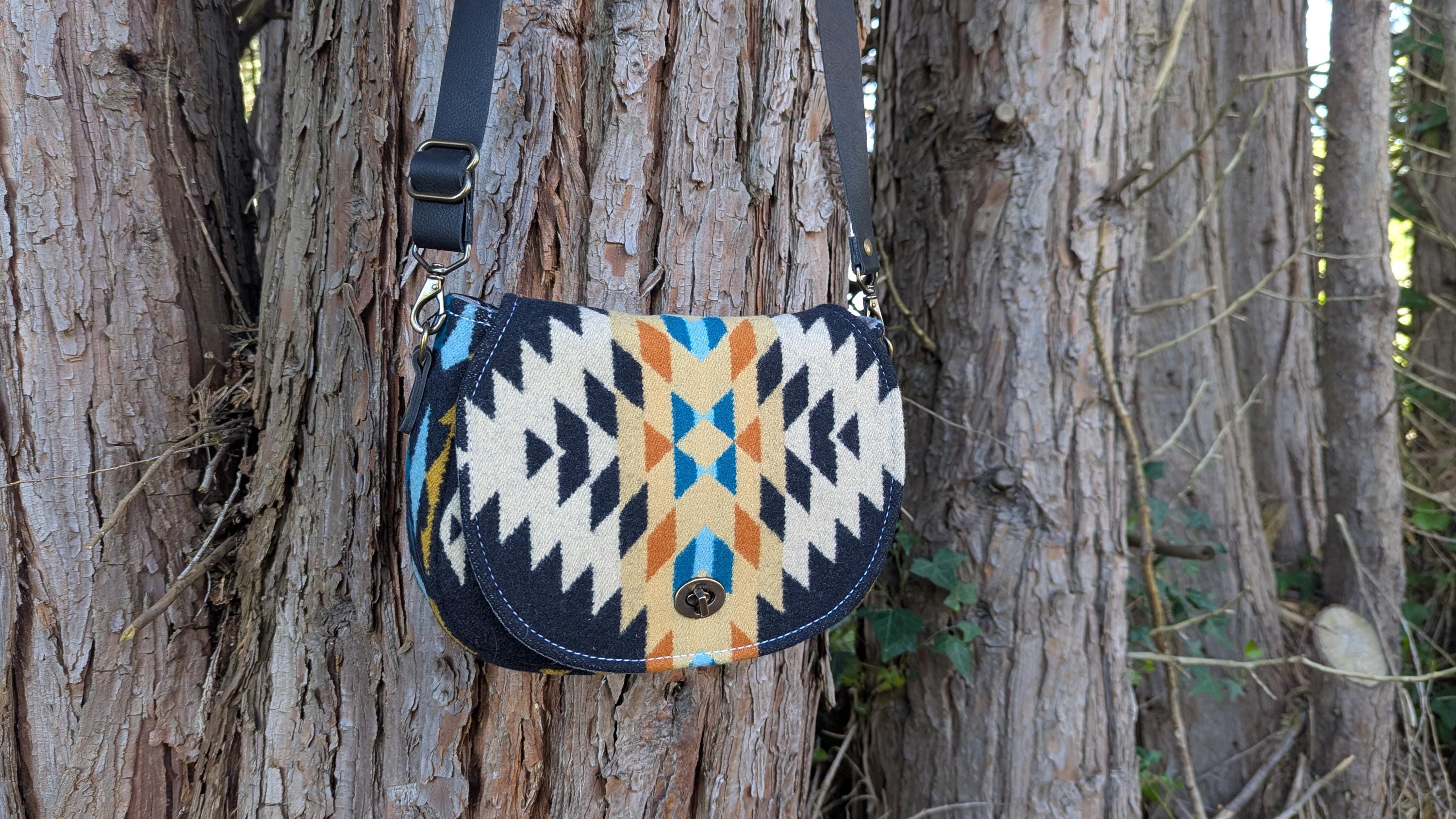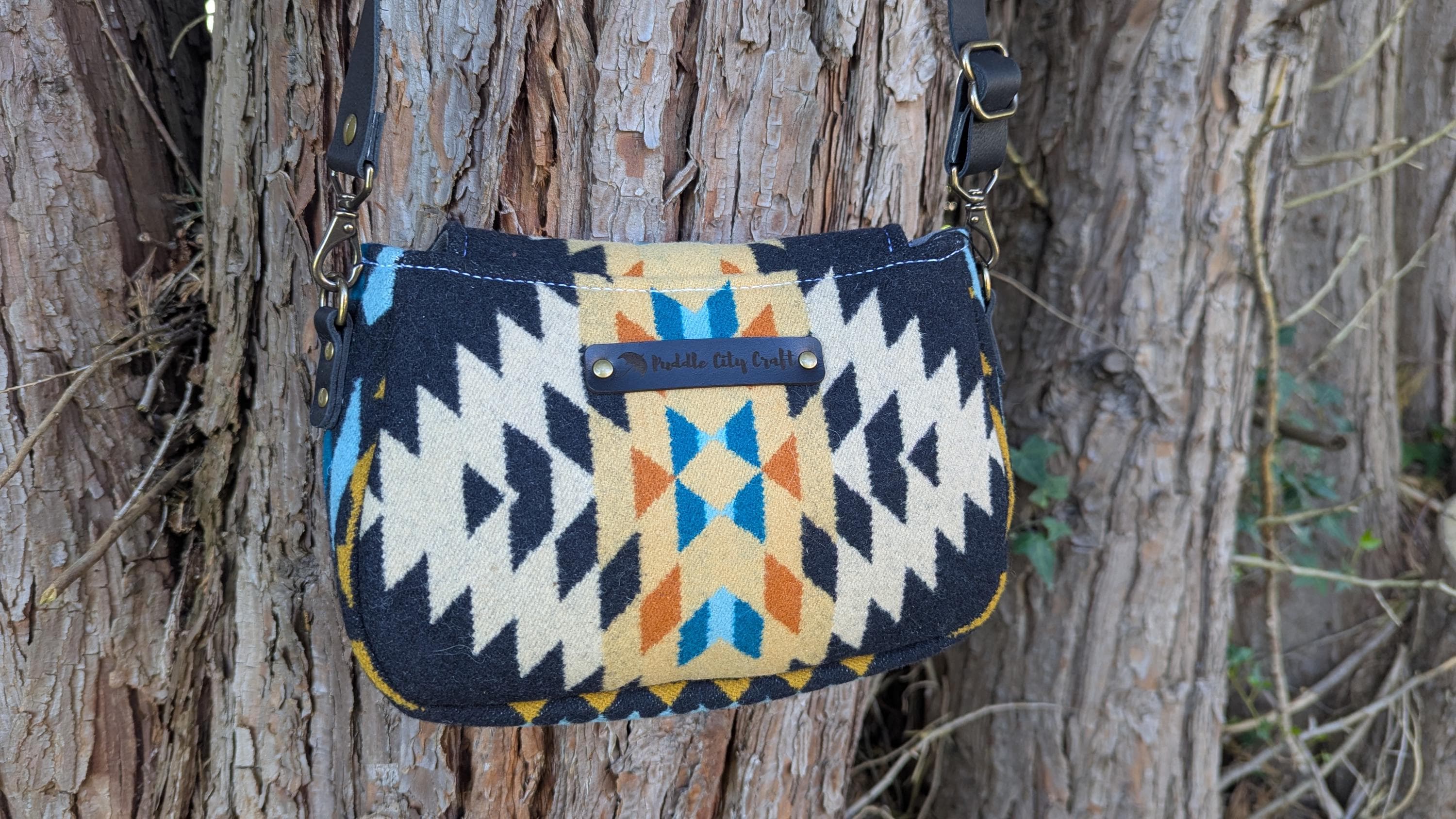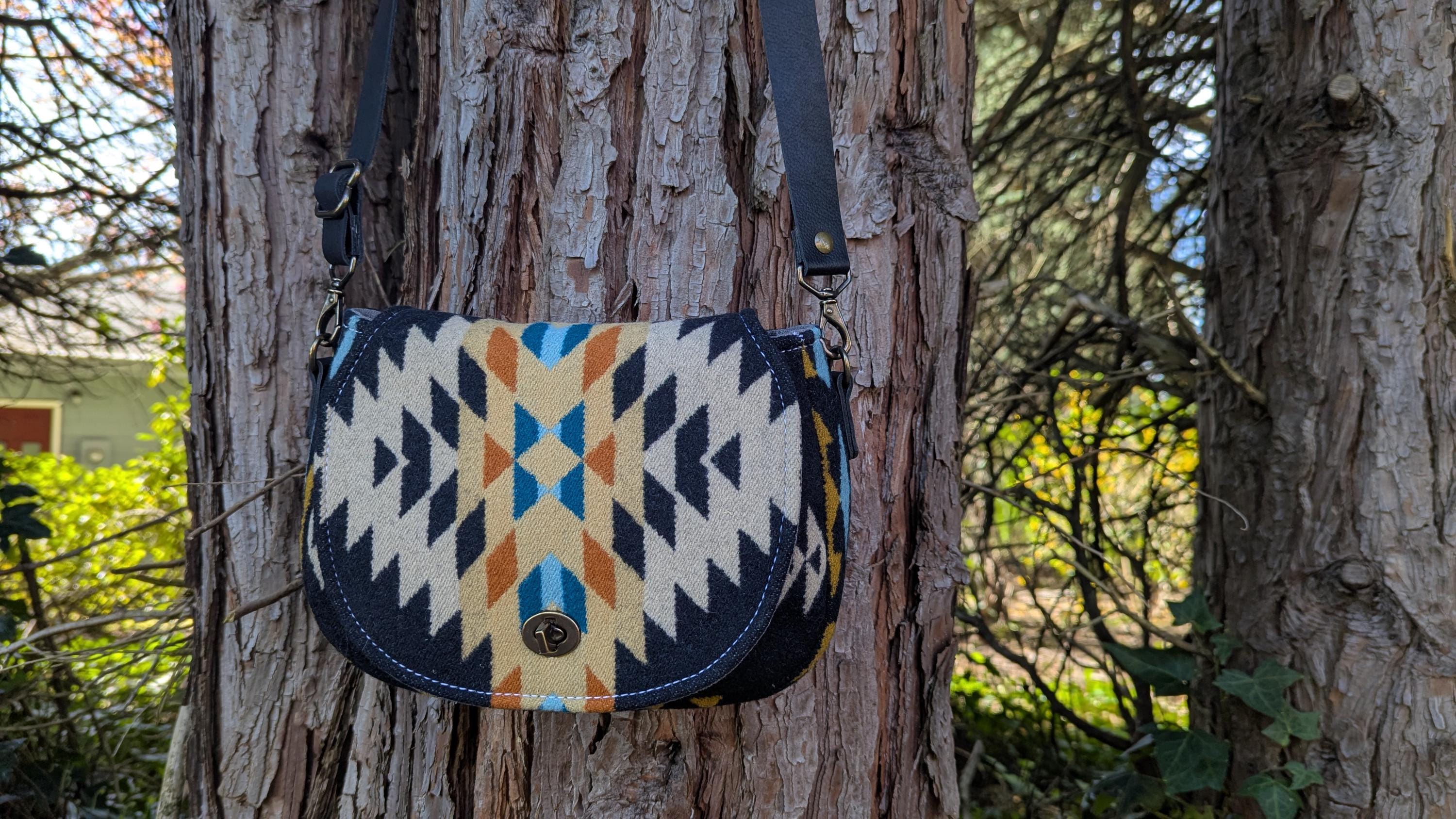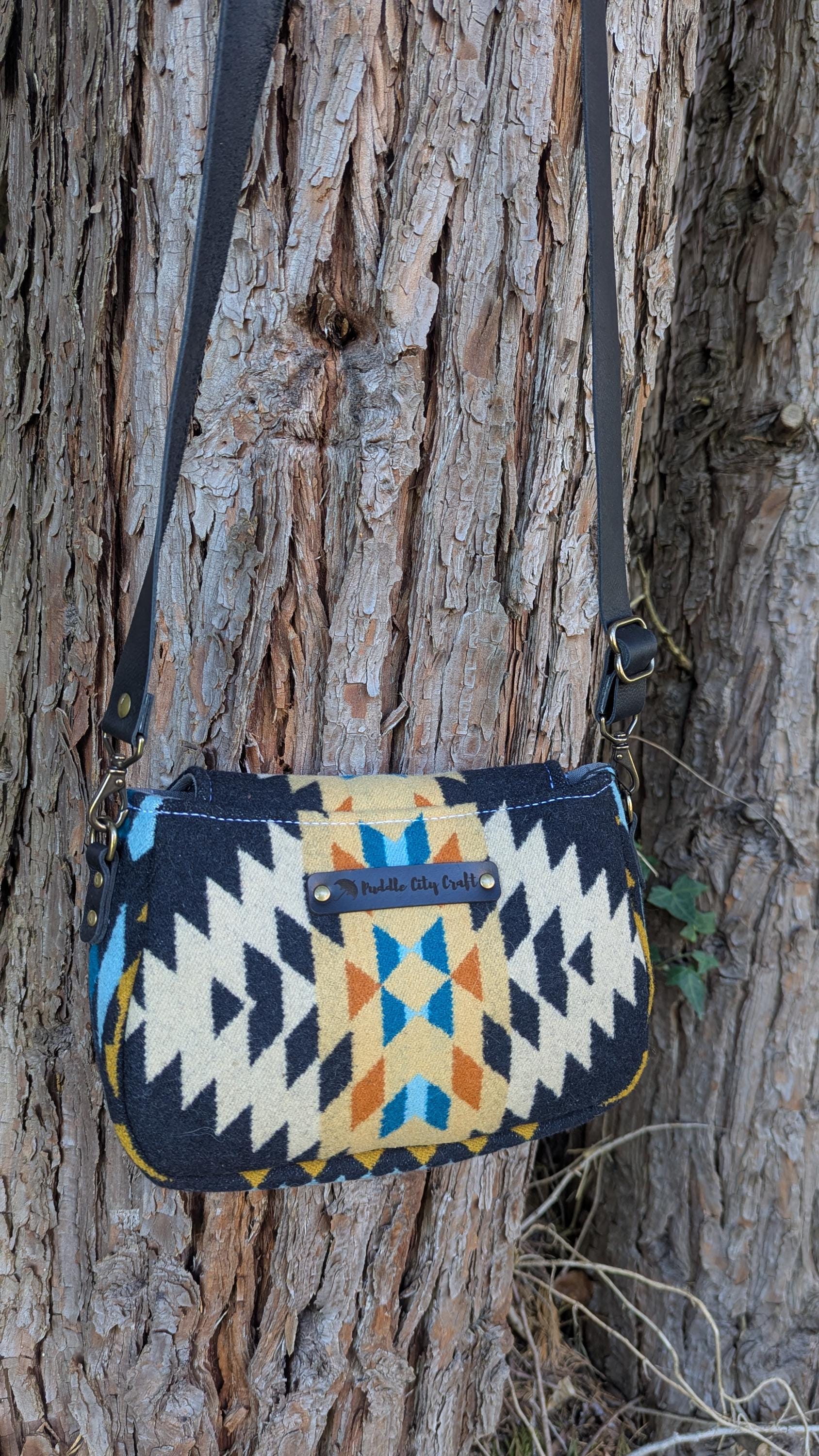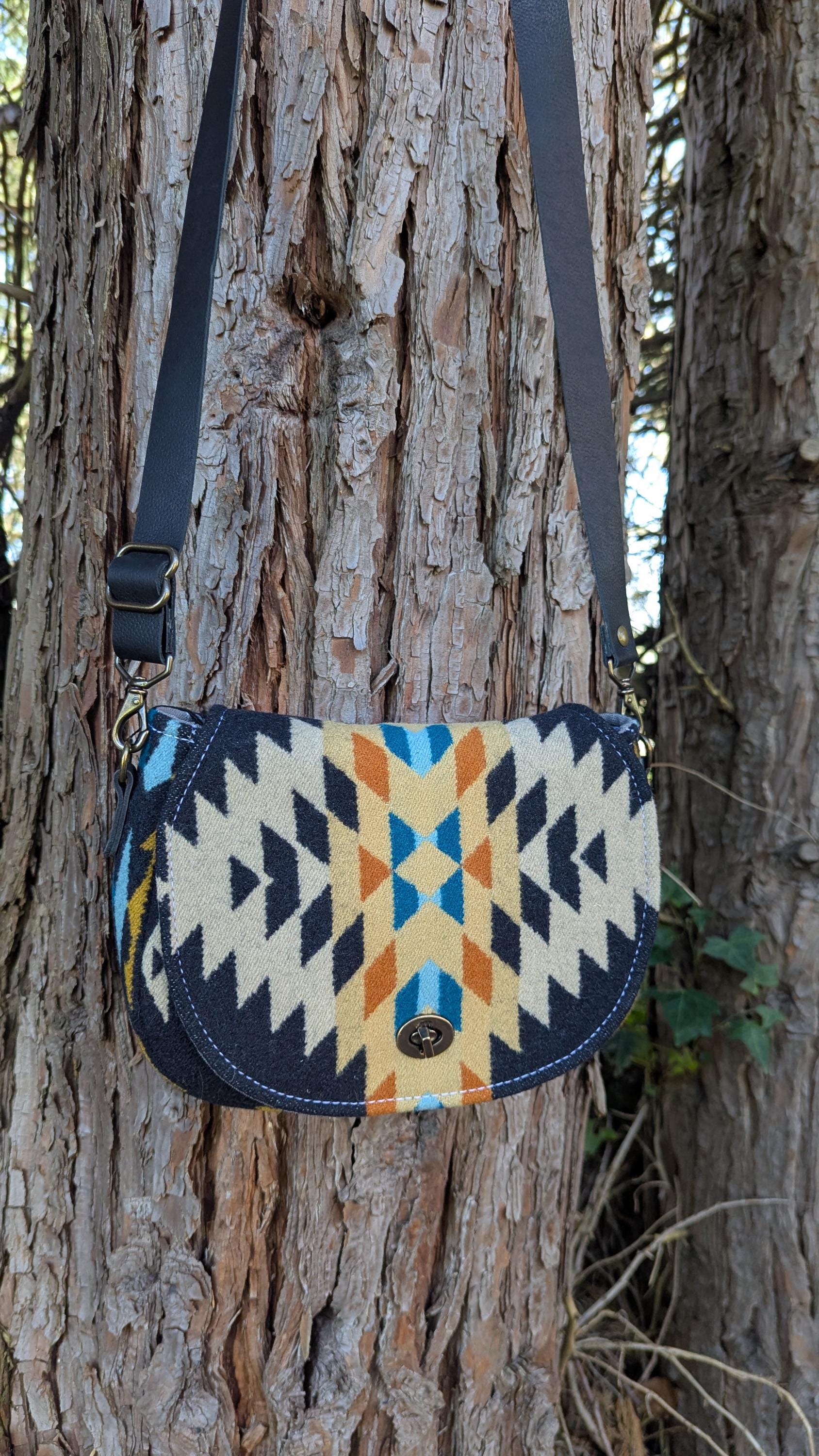 Medium Saddlebag style purse with twist lock closure. Handcrafted with with Pendleton® wool with a leather adjustable strap for crossbody or shoulder carry. Gray duck cloth lining with a slip pocket and one zip pocket inside for additional storage.