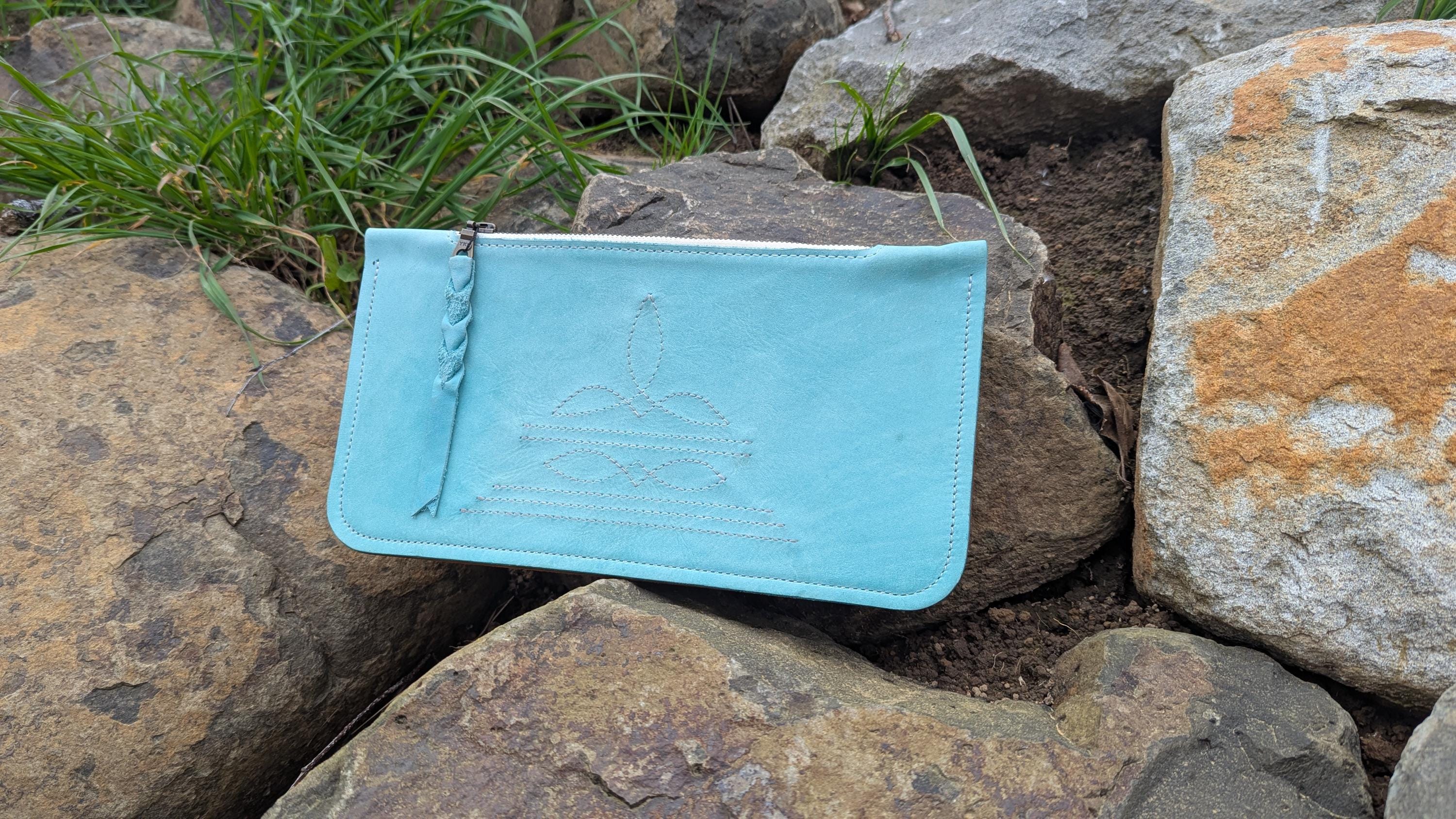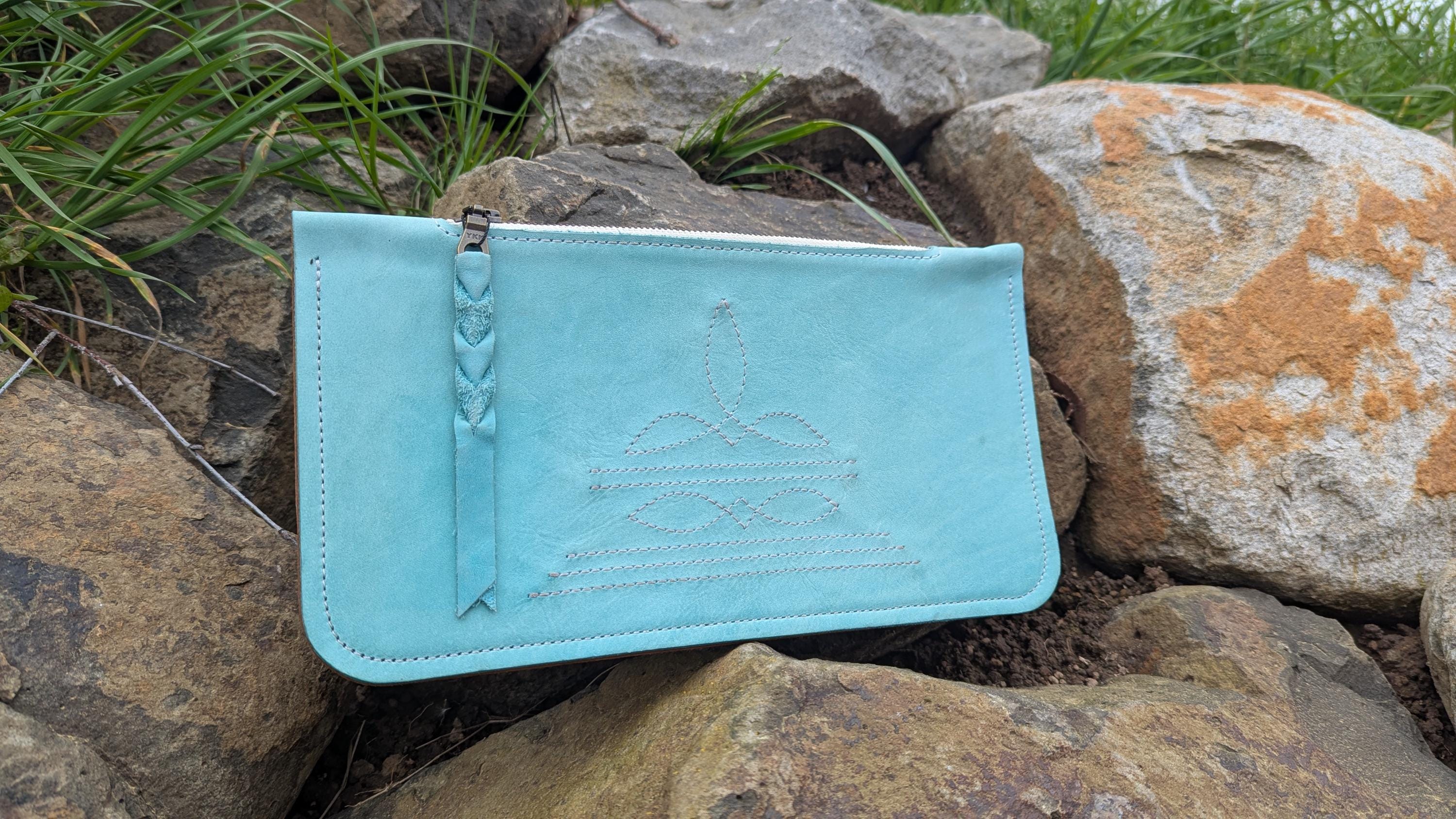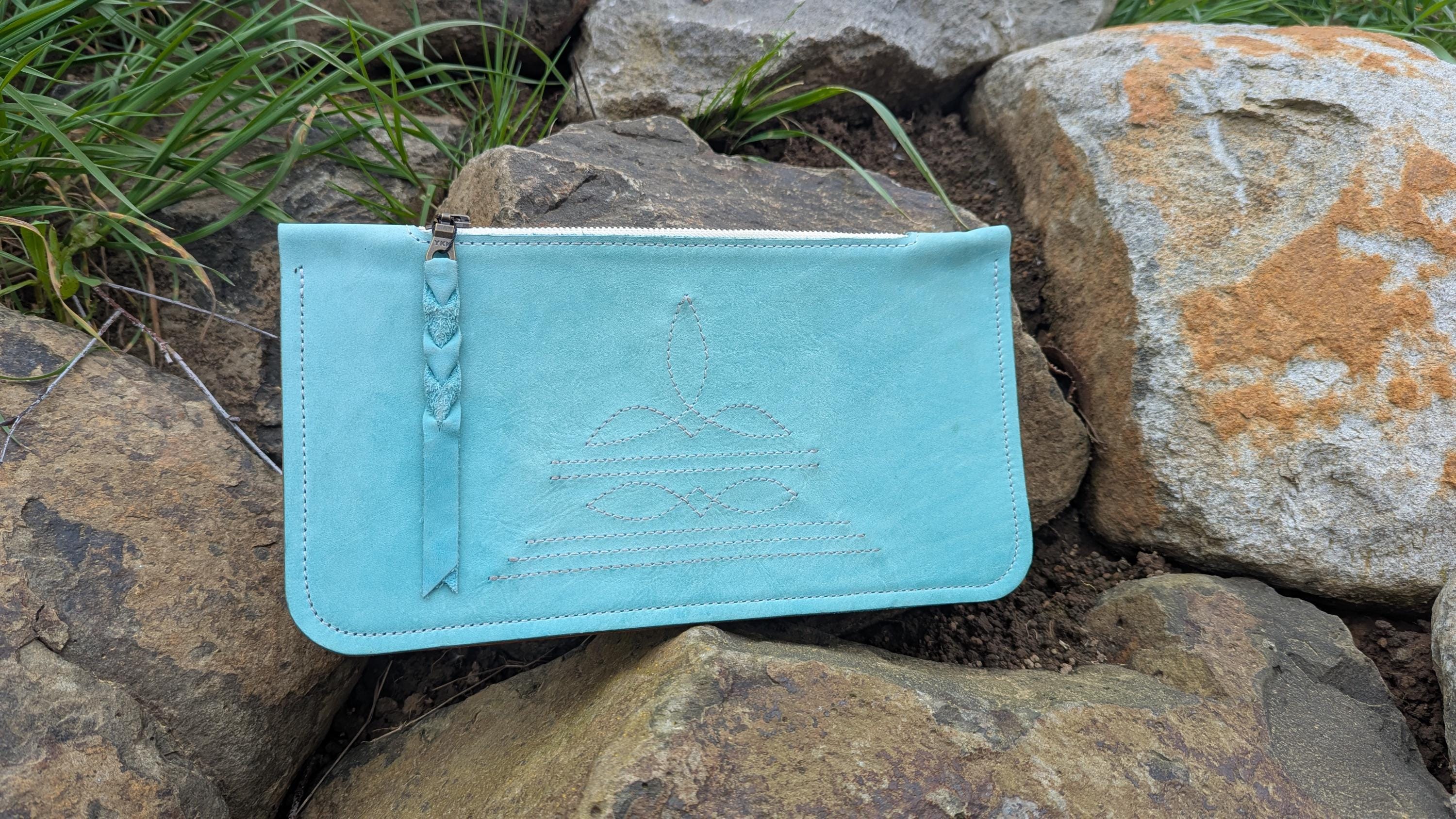 The bright turquoise color of this leather is so pretty and looks great with the contrast of the white stitching and zipper.