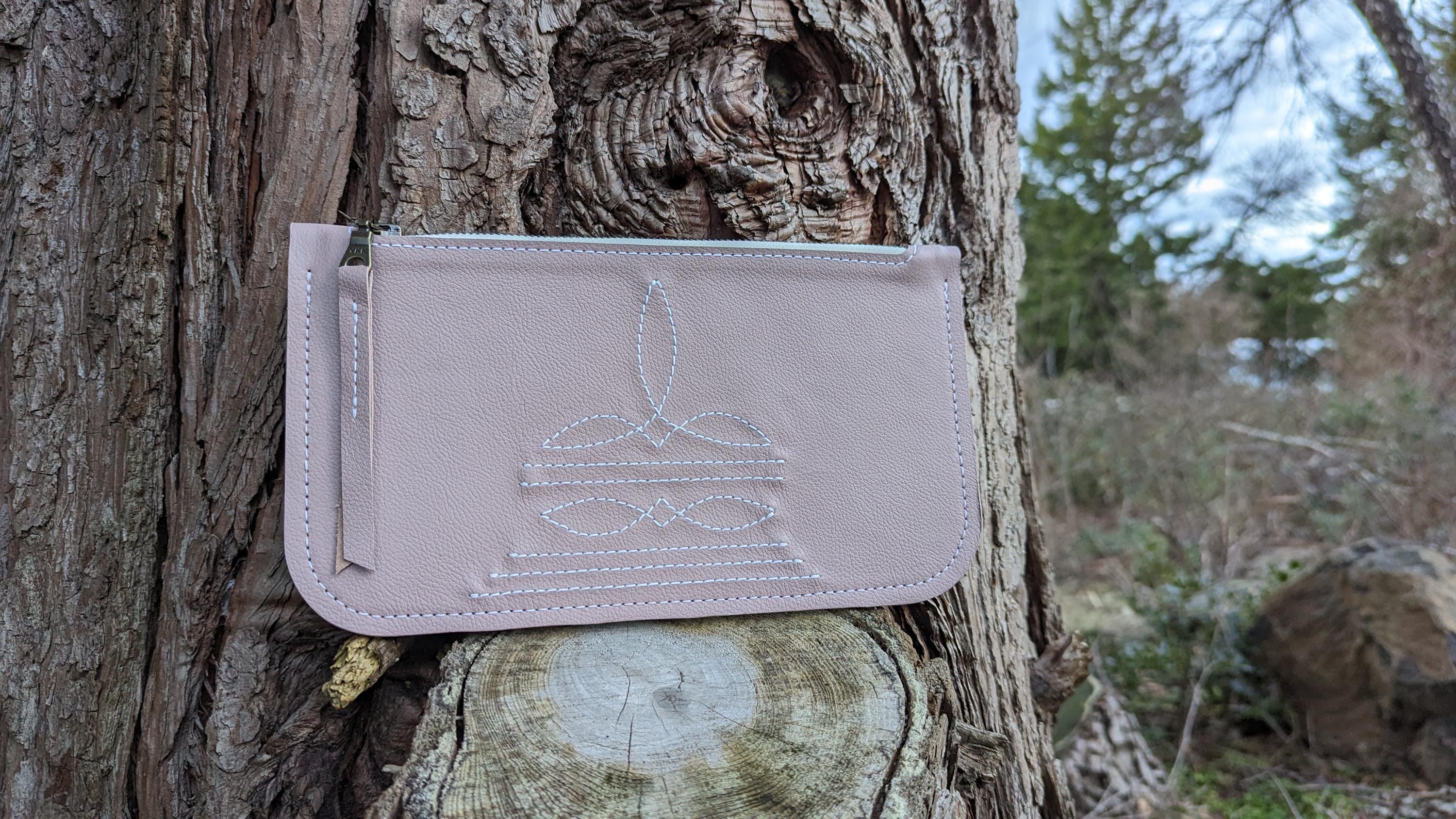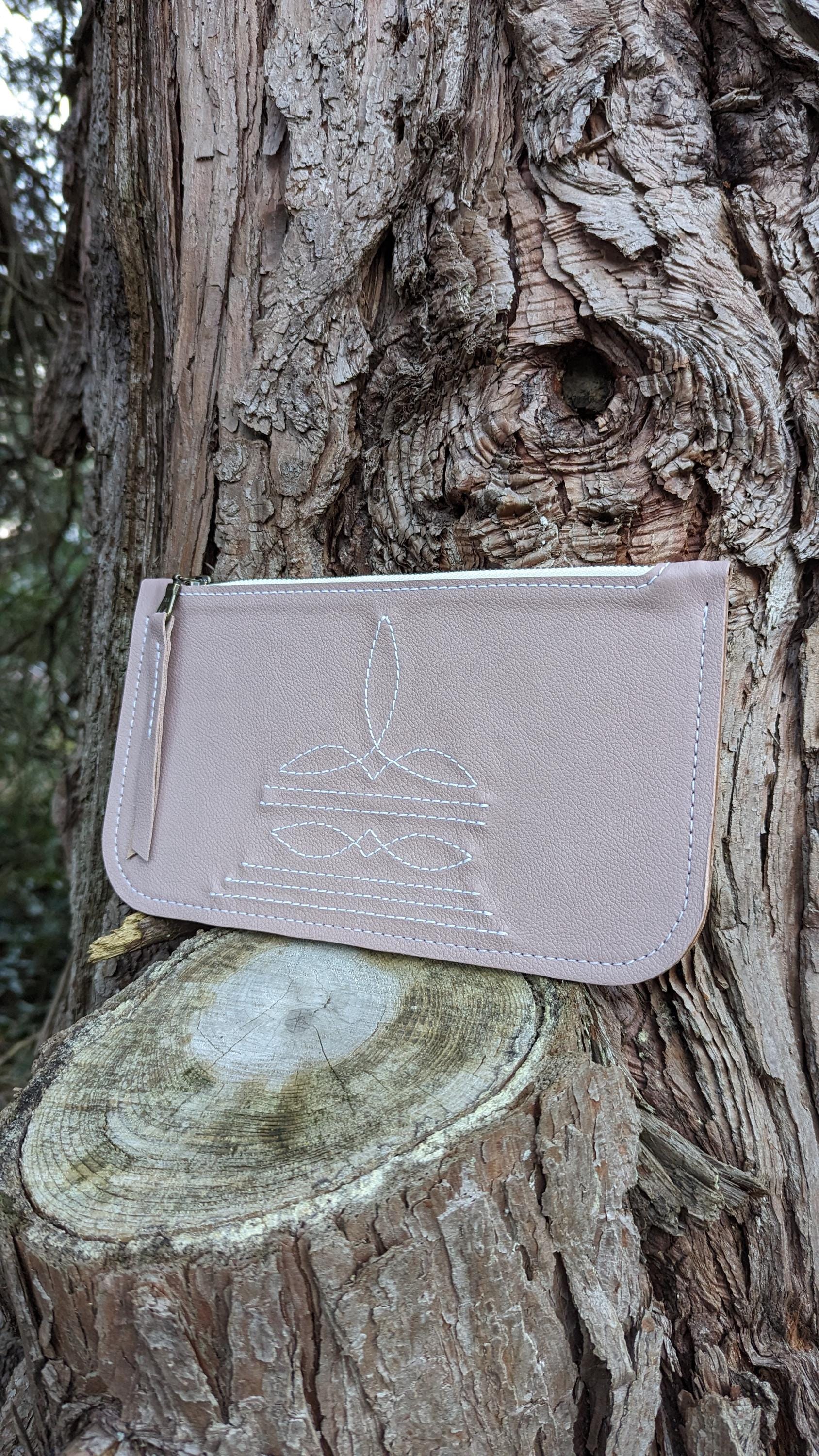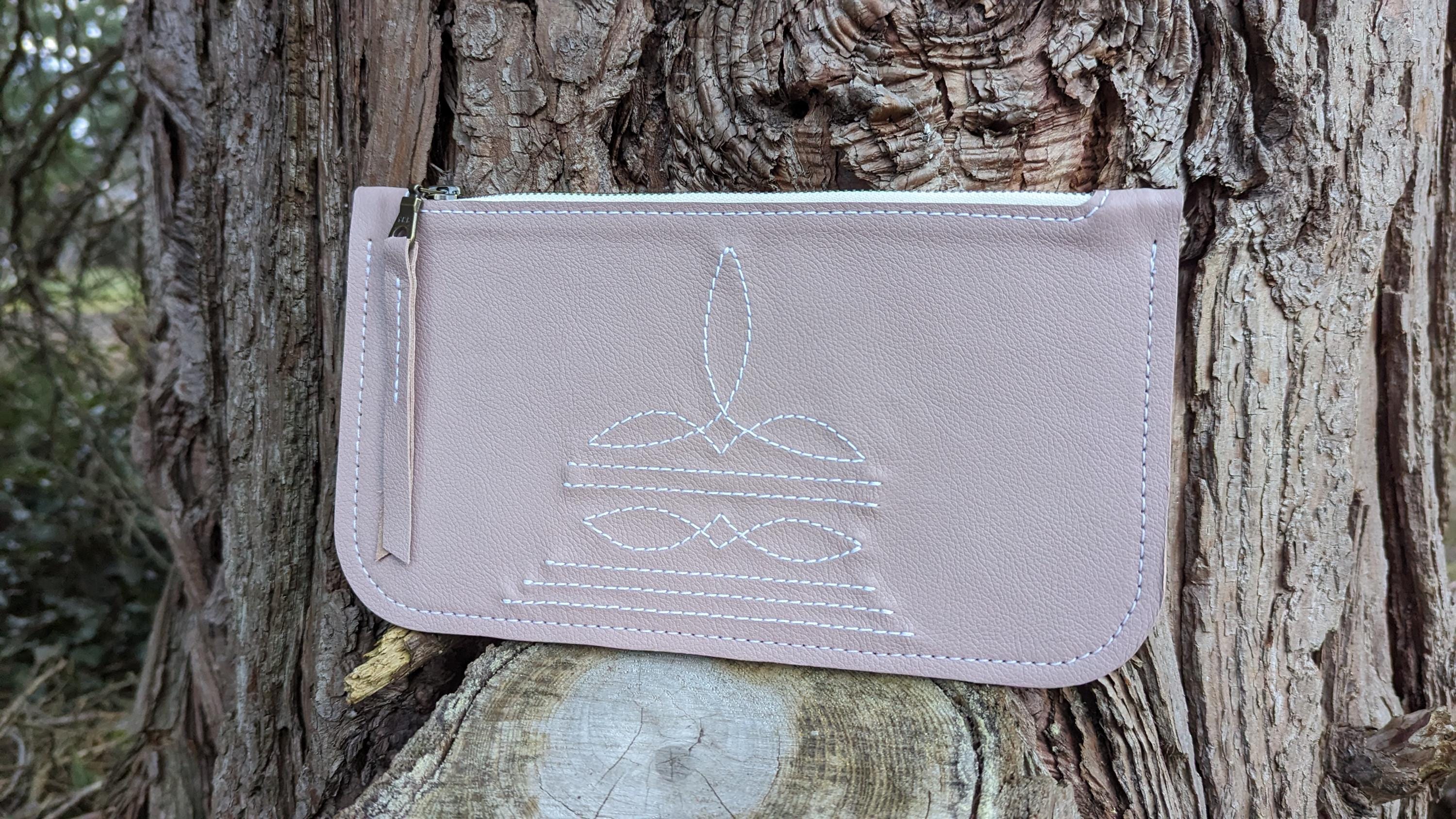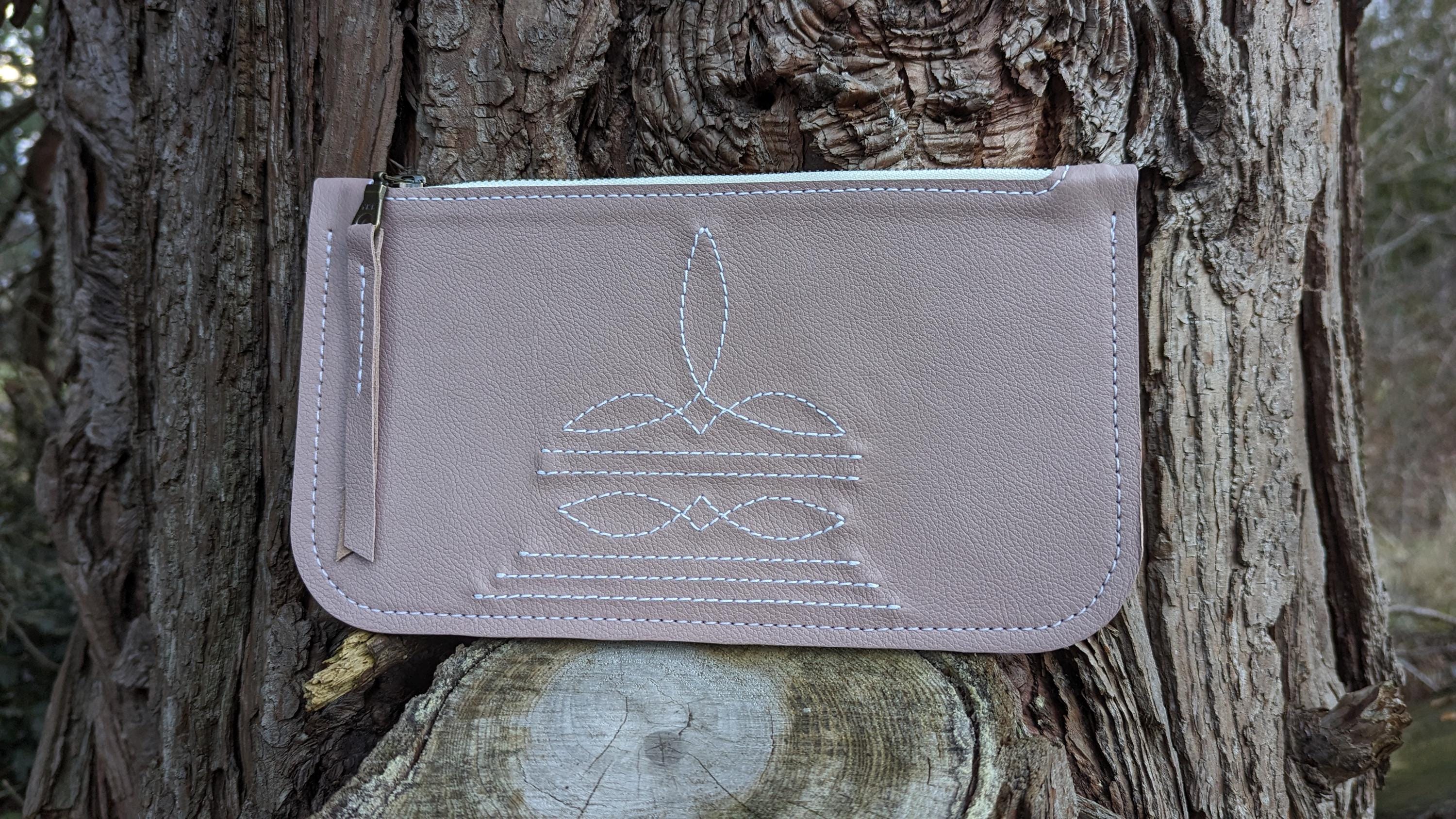 The dusty pink color of this leather is so pretty and looks great with the contrast of the white stitching and zipper.