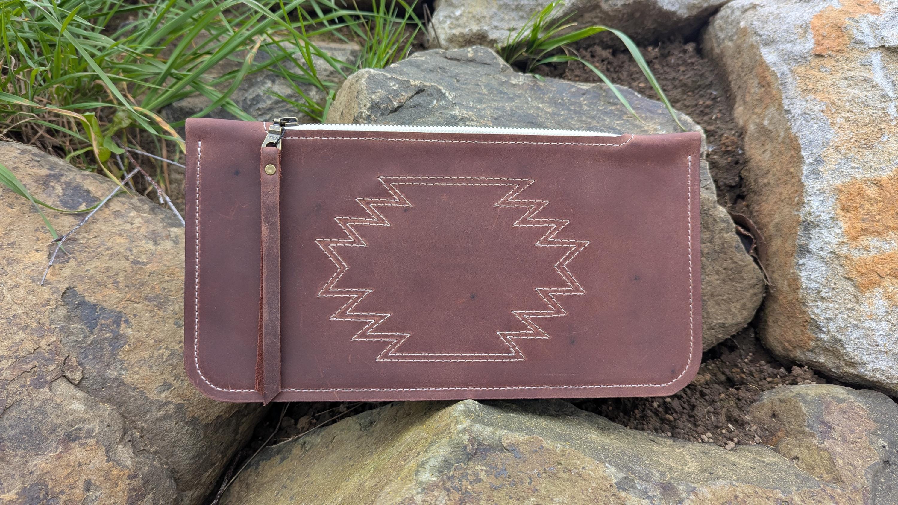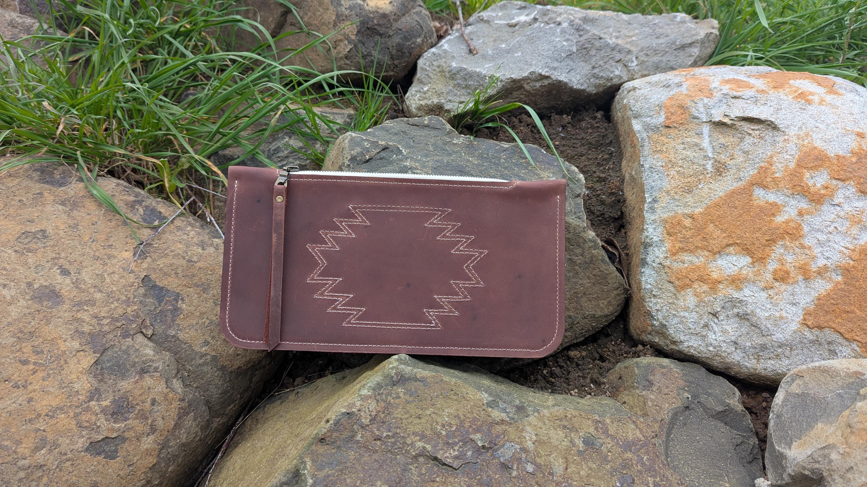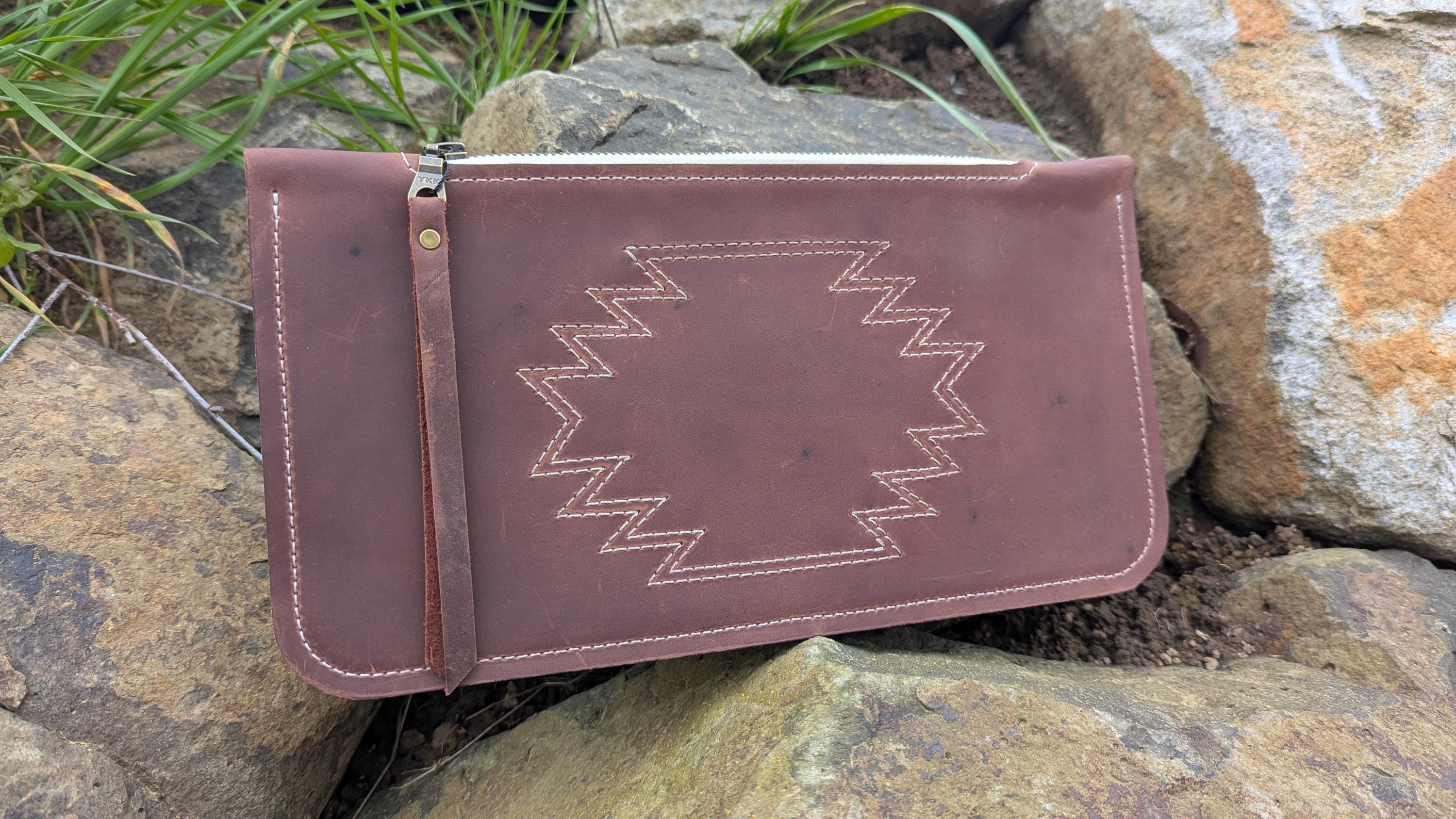 The red-brown color of this leather is so pretty and looks great with the contrast of the white stitching and zipper.