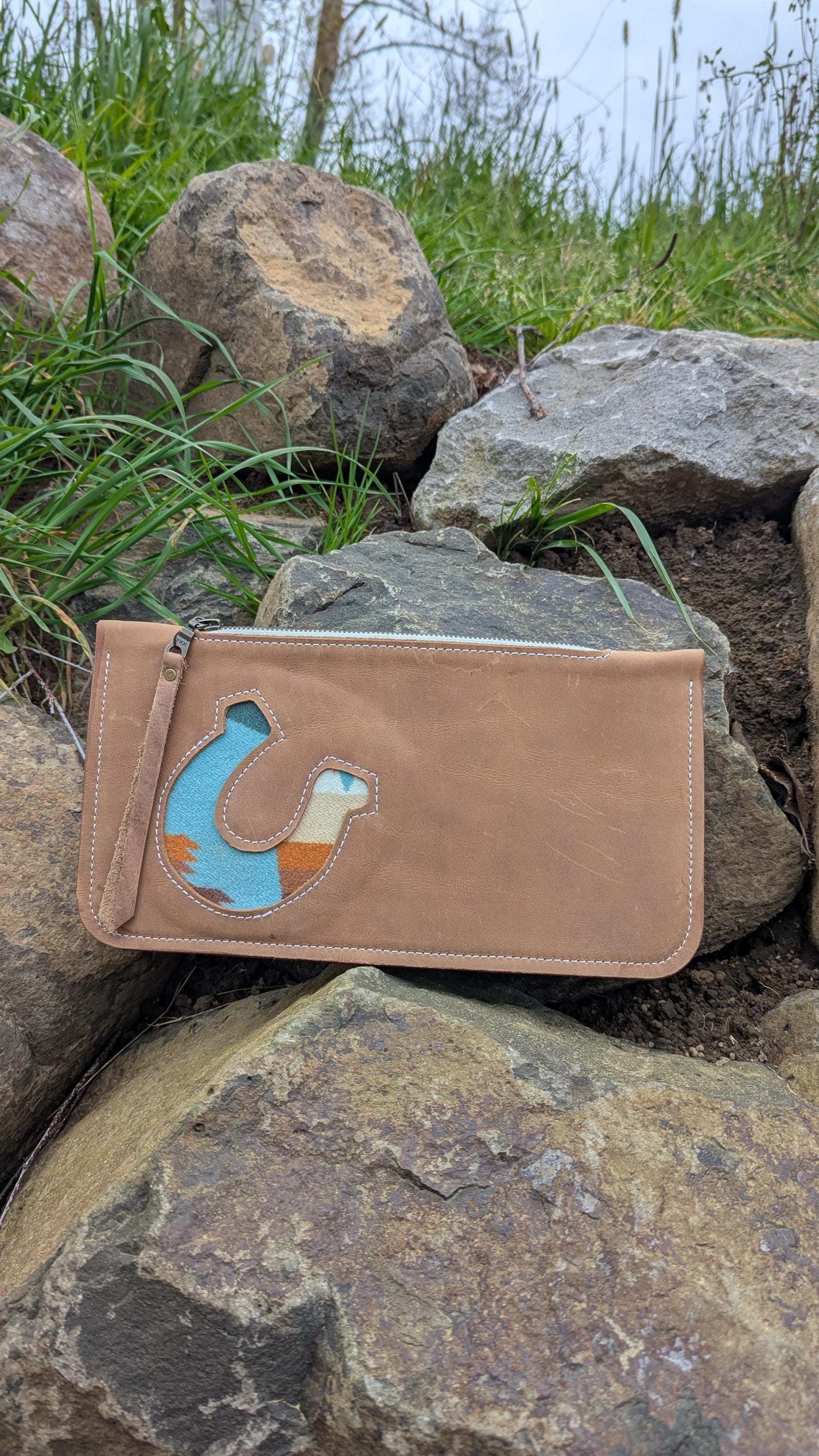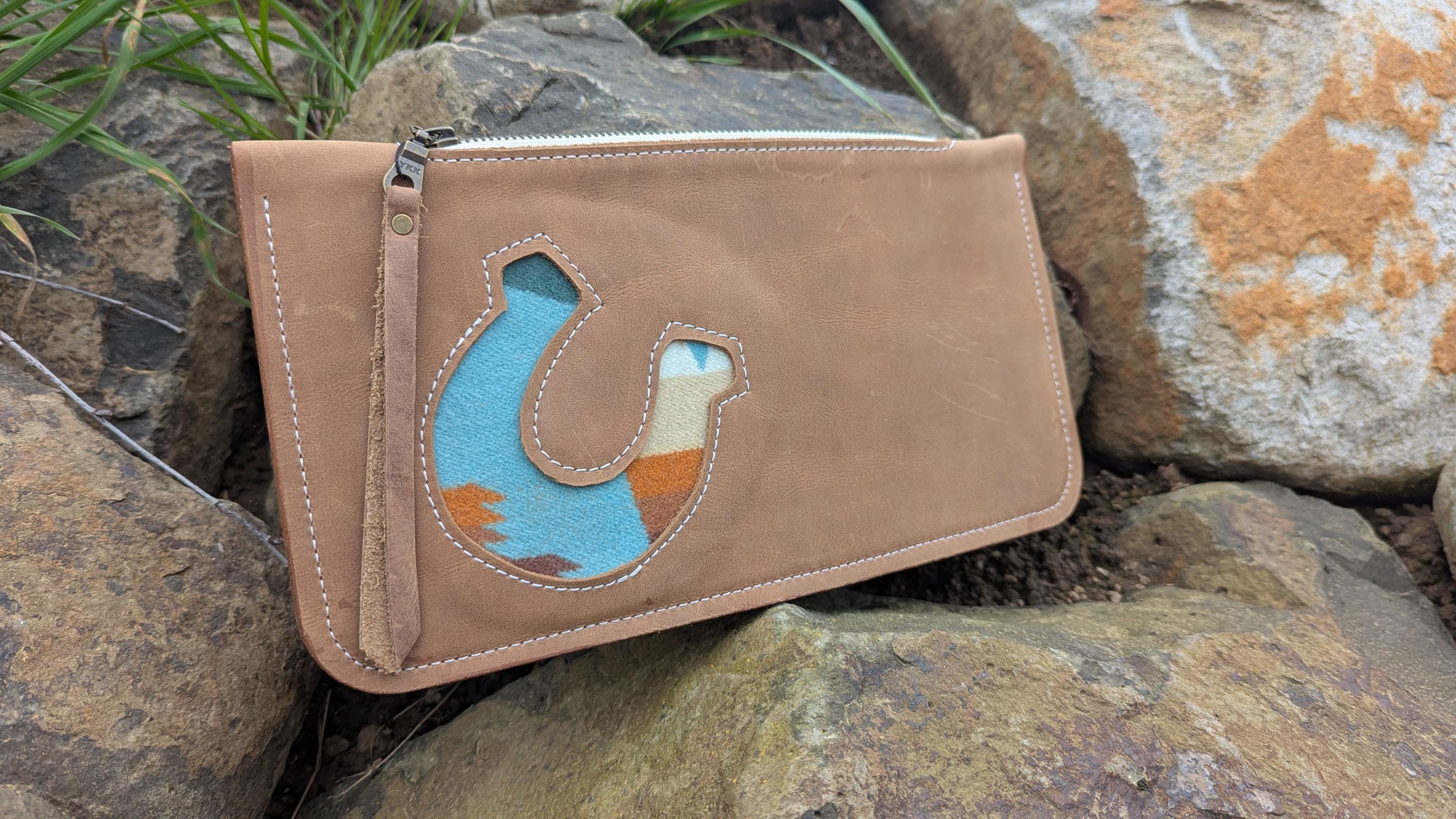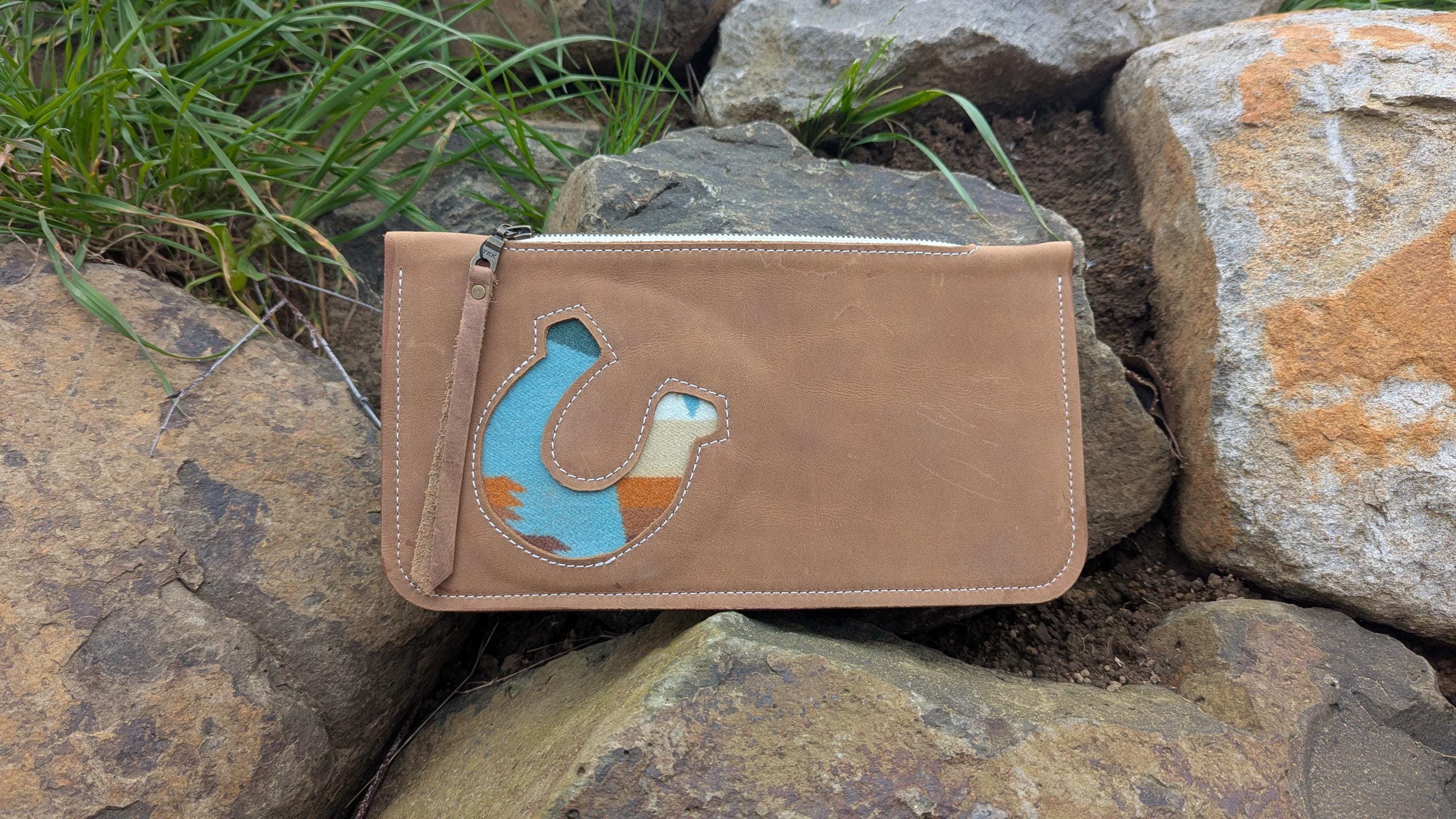 This beautiful western inspired stitched clutch with horseshoe design is perfect for a night out with all of your essentials. This is the larger of the two clutch size options I have. It easily fits a cell phone, Chapstick, cards and money.
