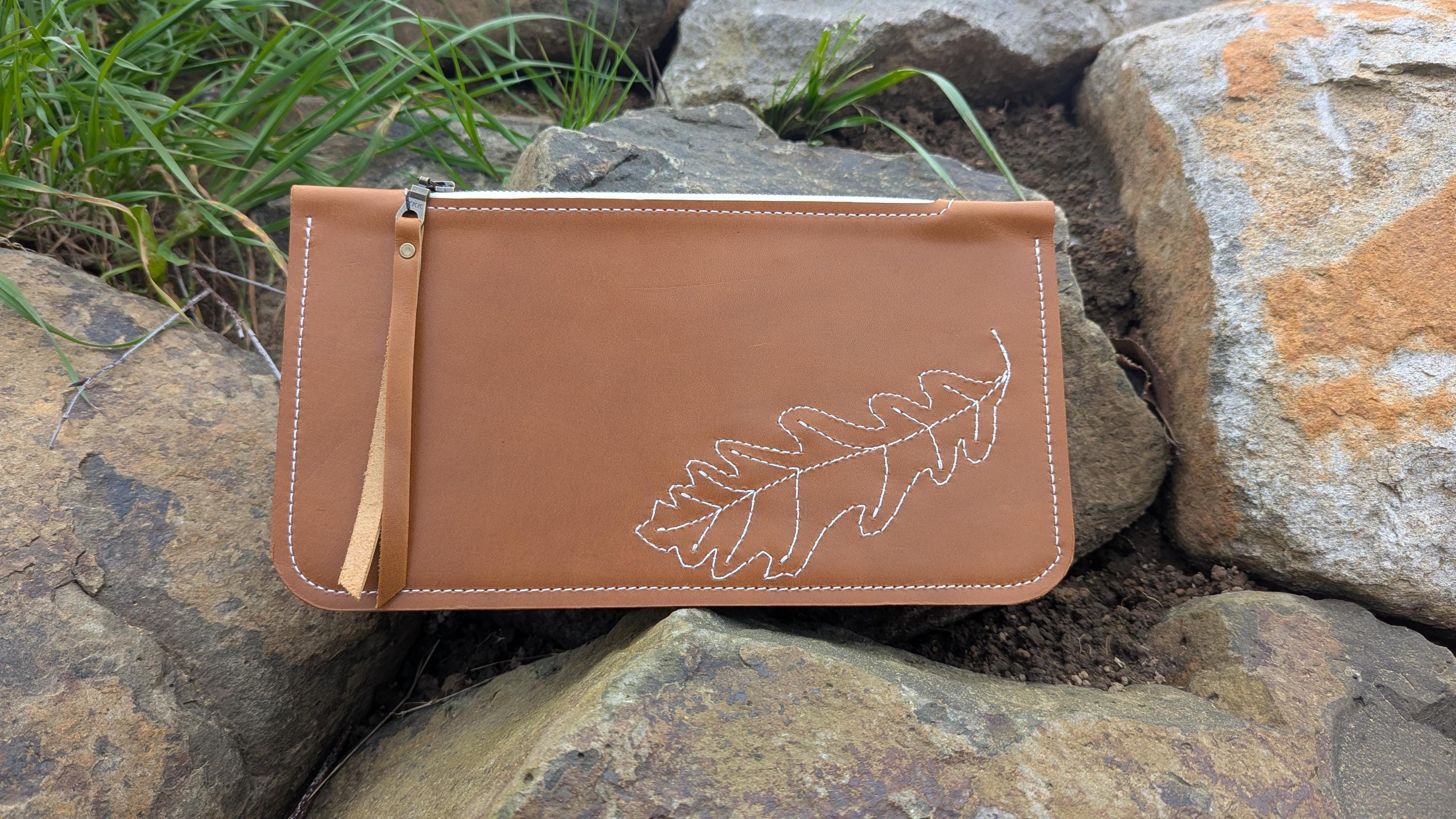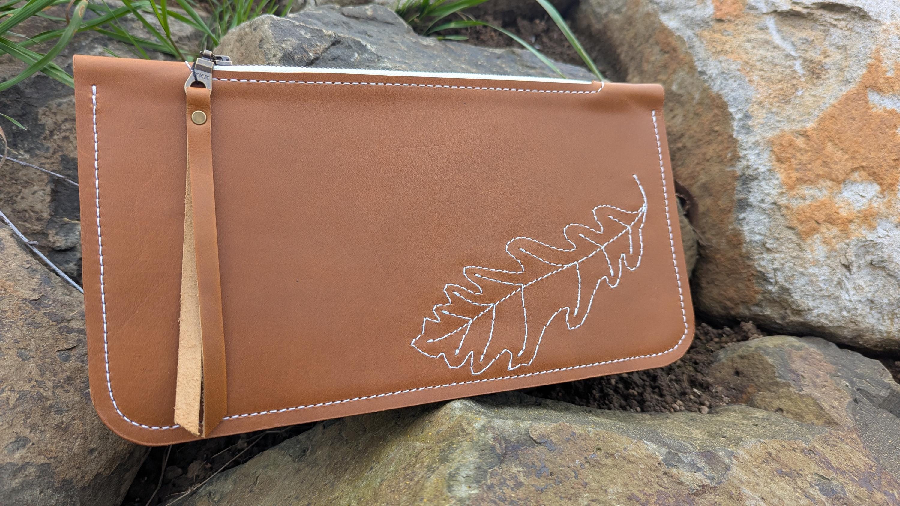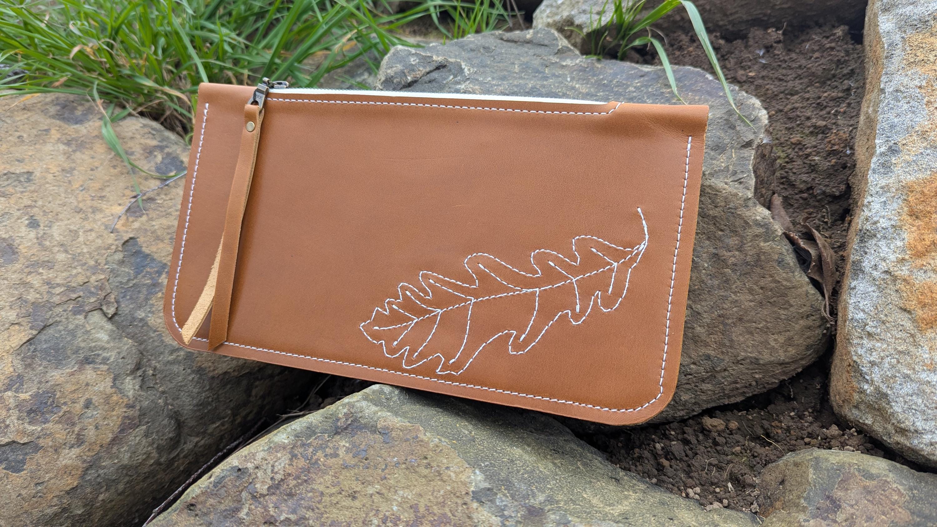 This beautiful stitched clutch with Oak leaf design is perfect for a night out with all of your essentials. This is the larger of the two clutch size options I have. It easily fits a cell phone, Chapstick, cards and money.