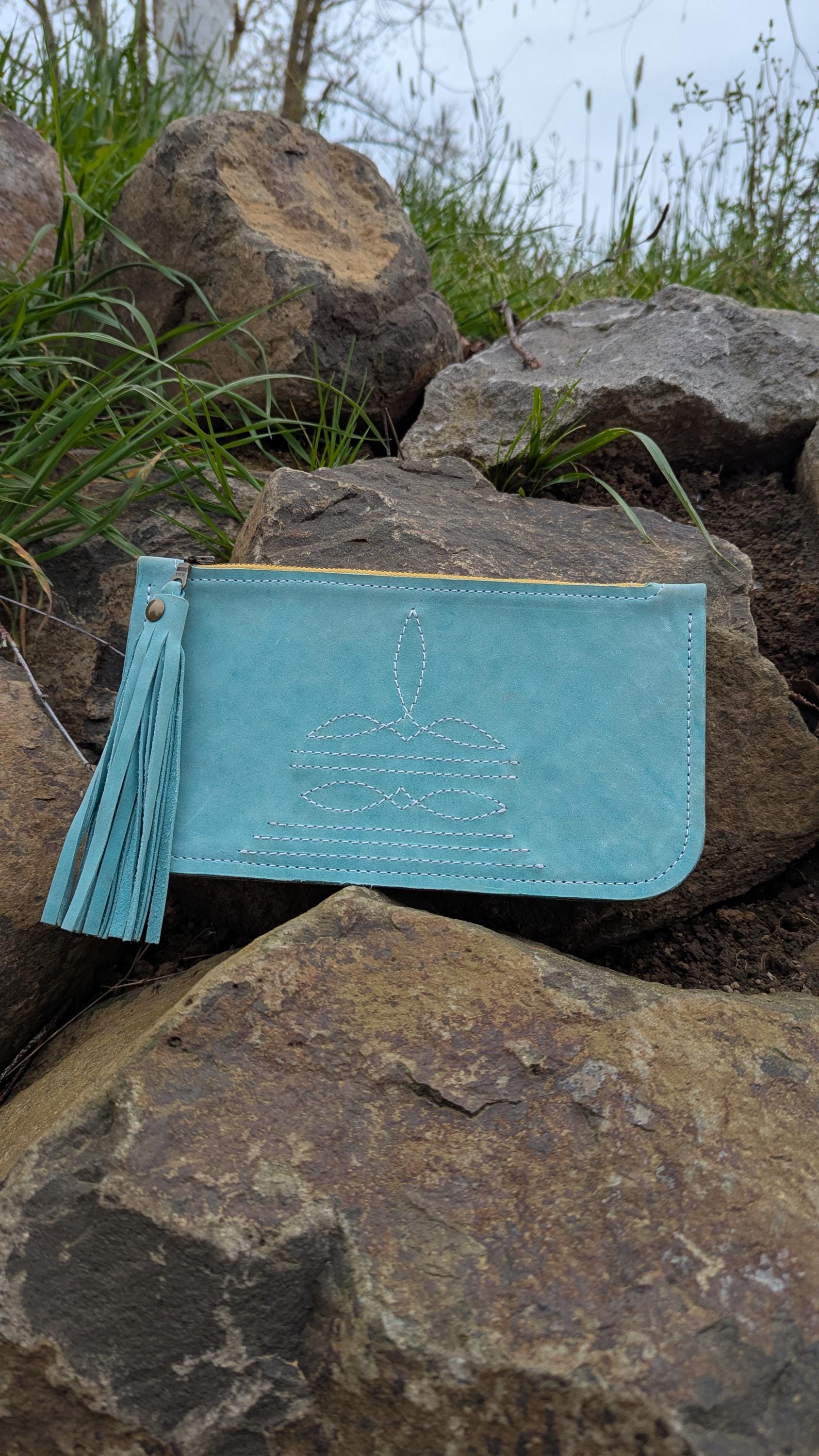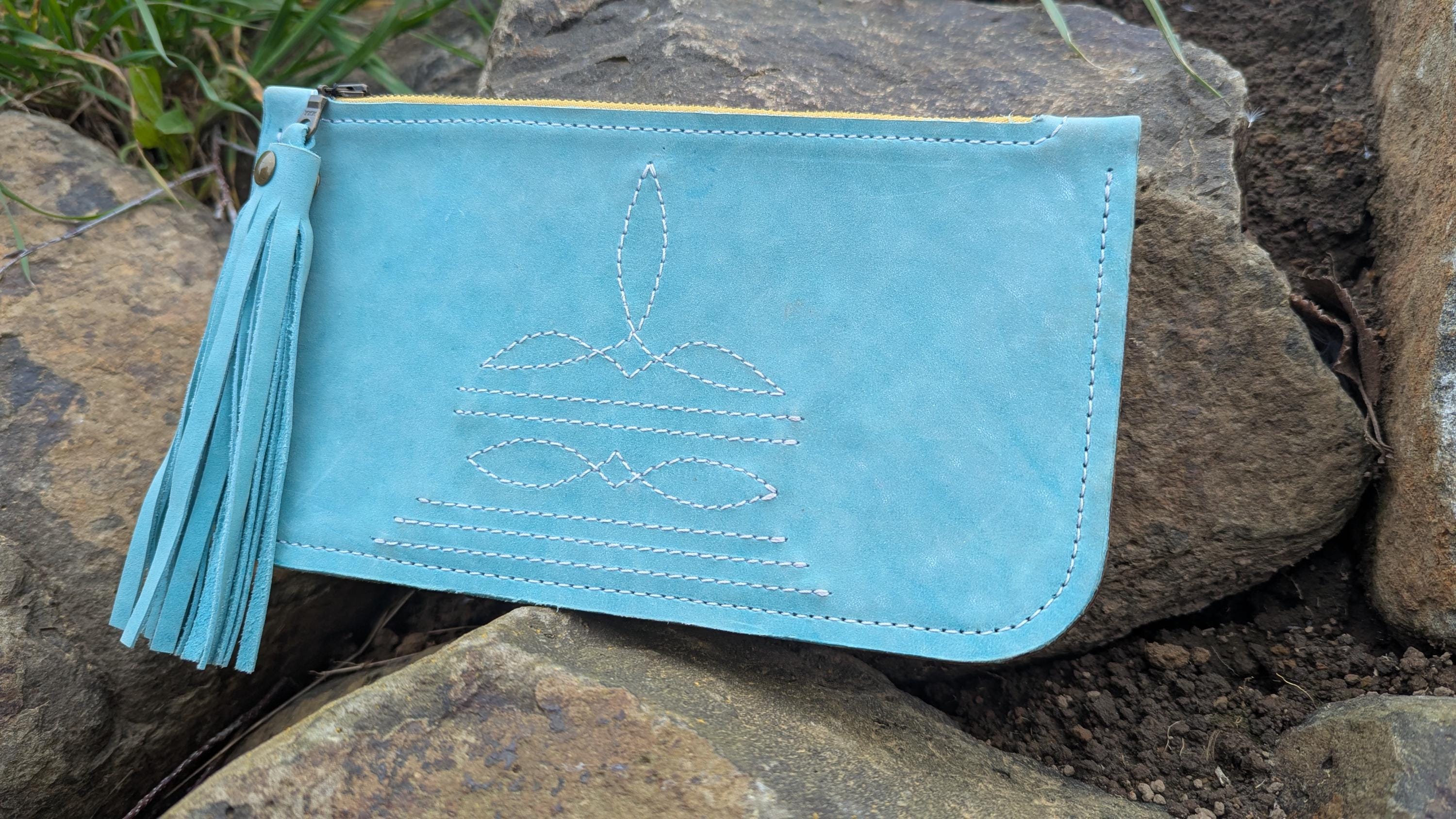 This beautiful western inspired stitched clutch is perfect for a night out or for added storage to a large purse or tote.