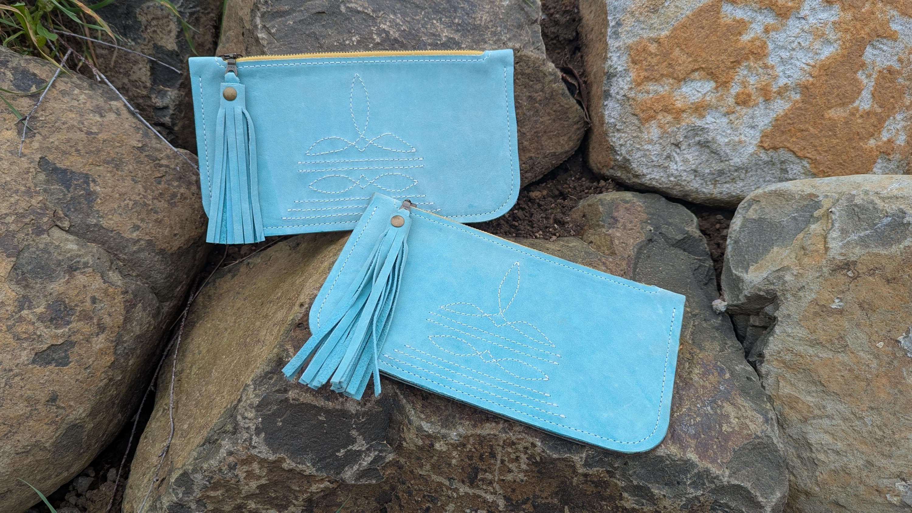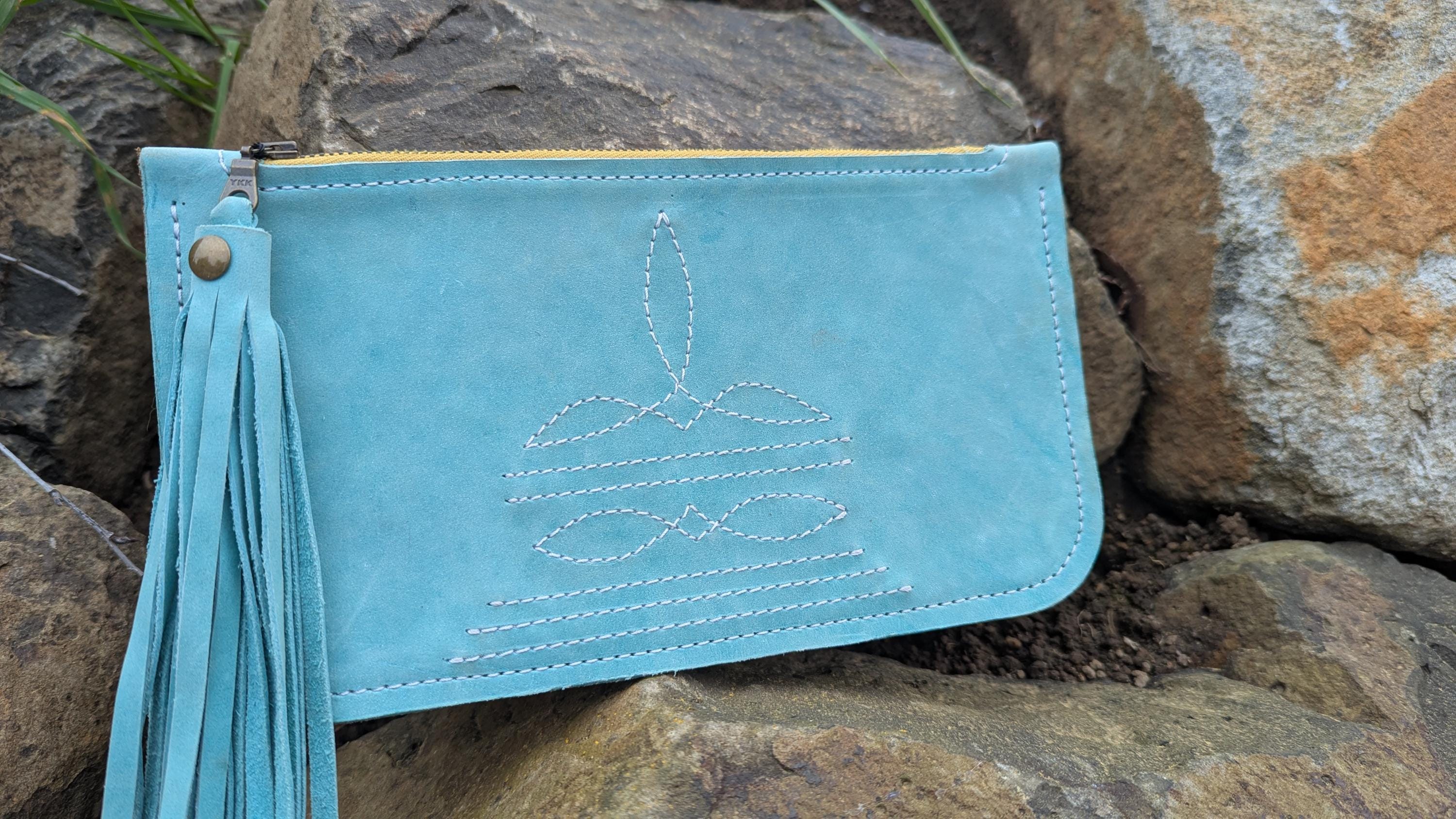 The bright turquoise color of this leather is so pretty and looks great with the contrast of the mustard yellow stitching and zipper.