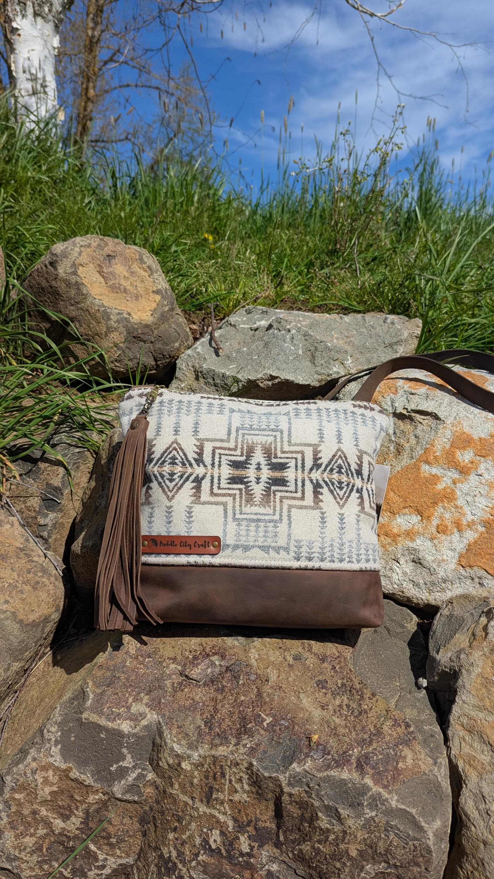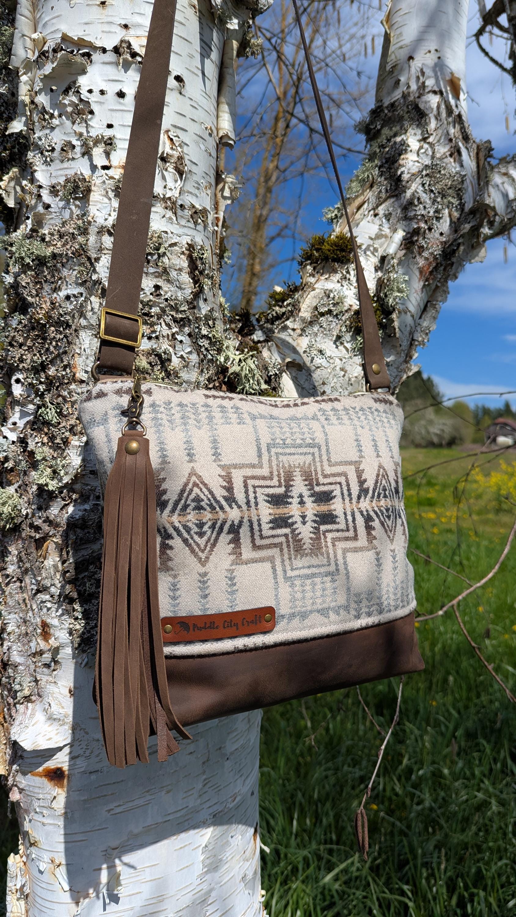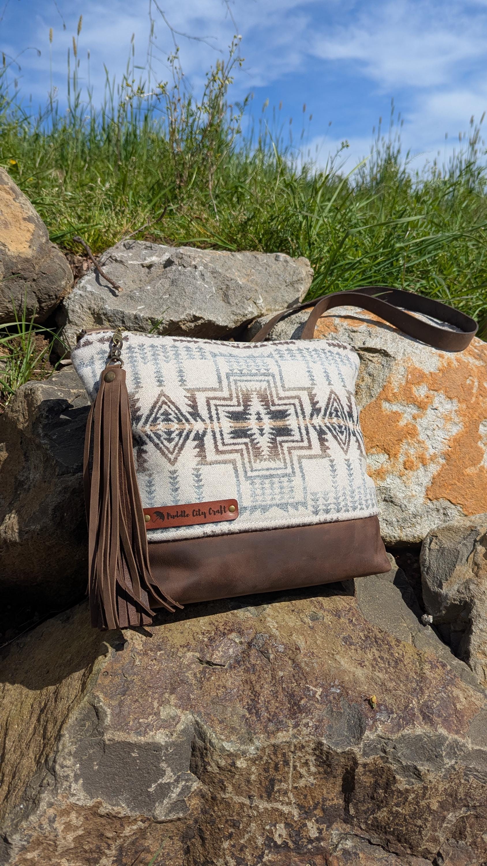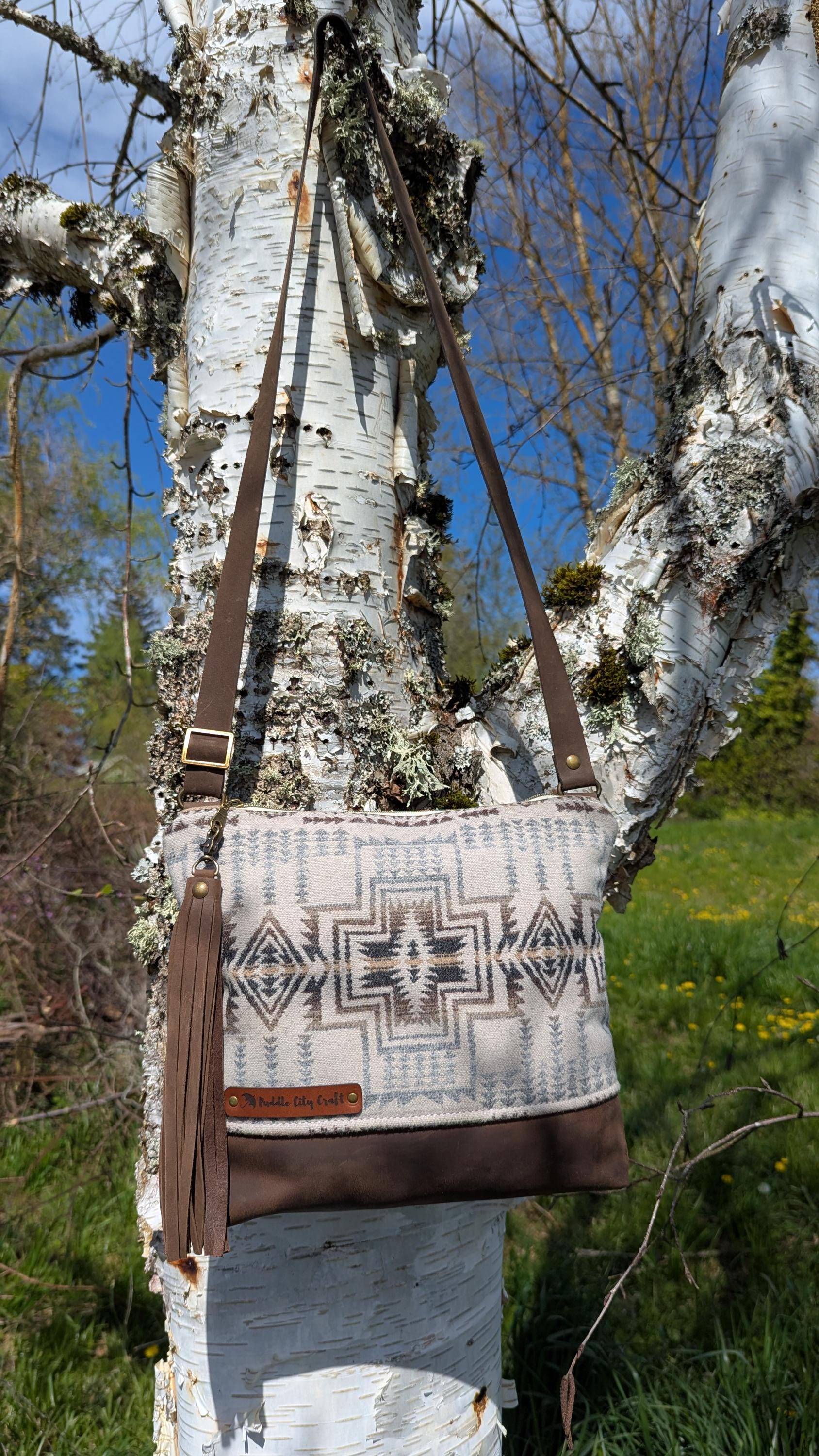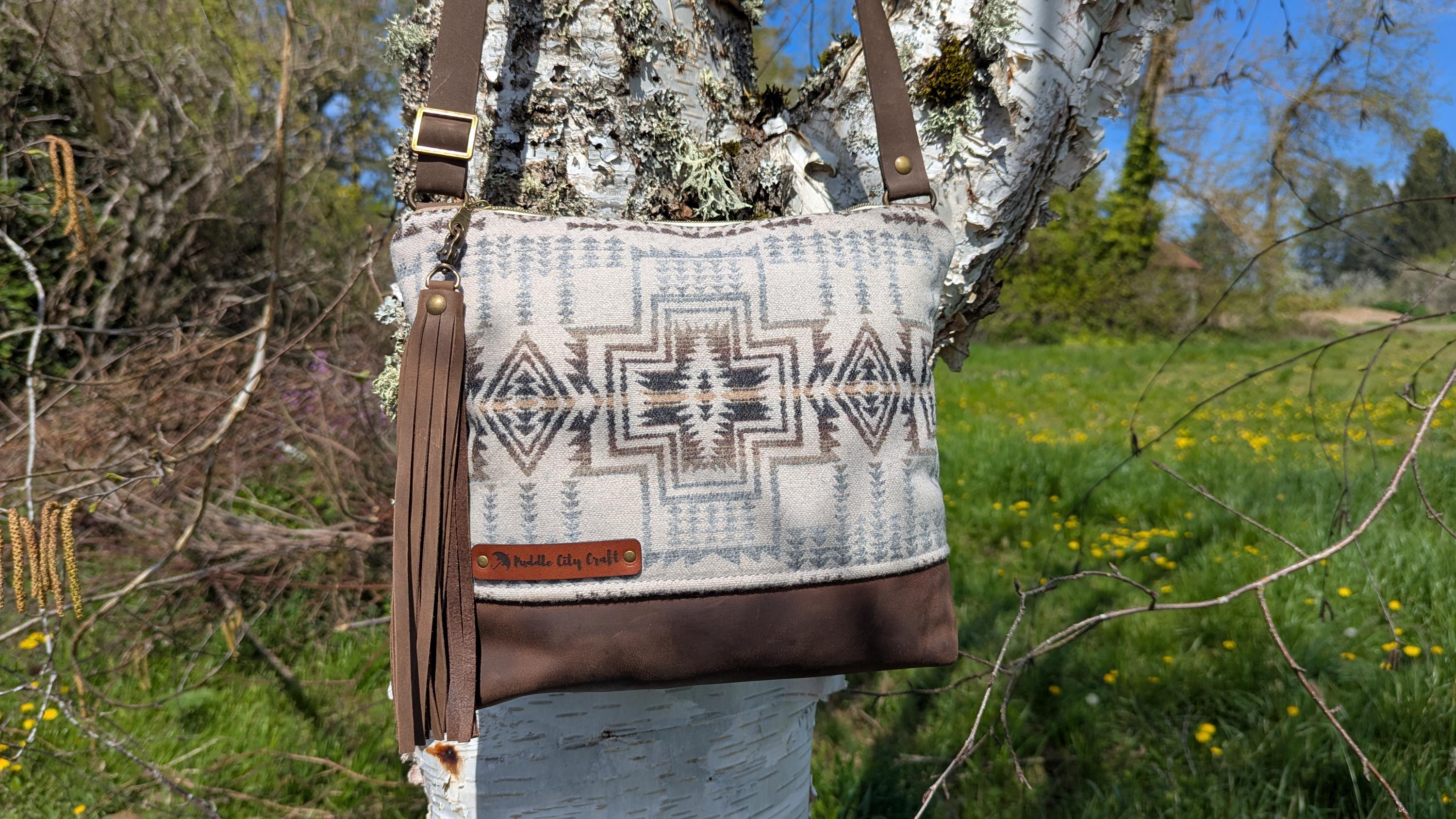 Large sized bag made with Pendleton® wool and leather with crossbody adjustable strap. Natural colored cotton lining with two slip pockets and one zip pocket inside for additional storage.