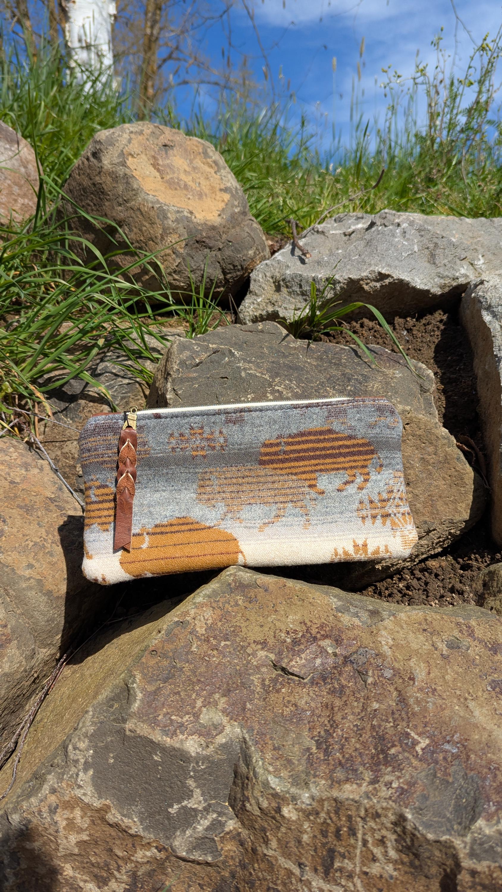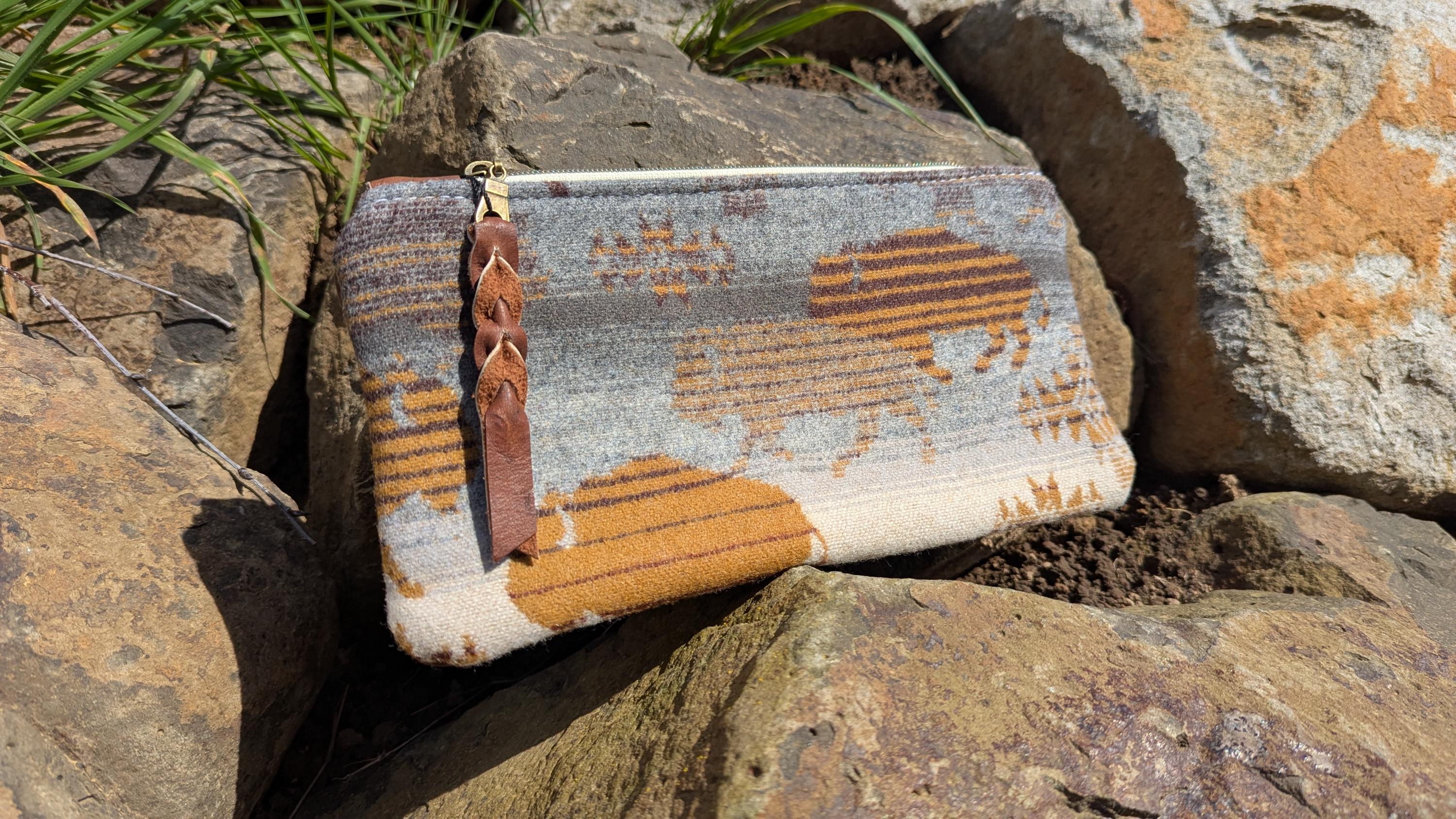 This beautiful clutch is made with Pendleton wool® and leather. Inside lining is cotton which includes one side with a zip pocket and the opposite with two slip pockets.