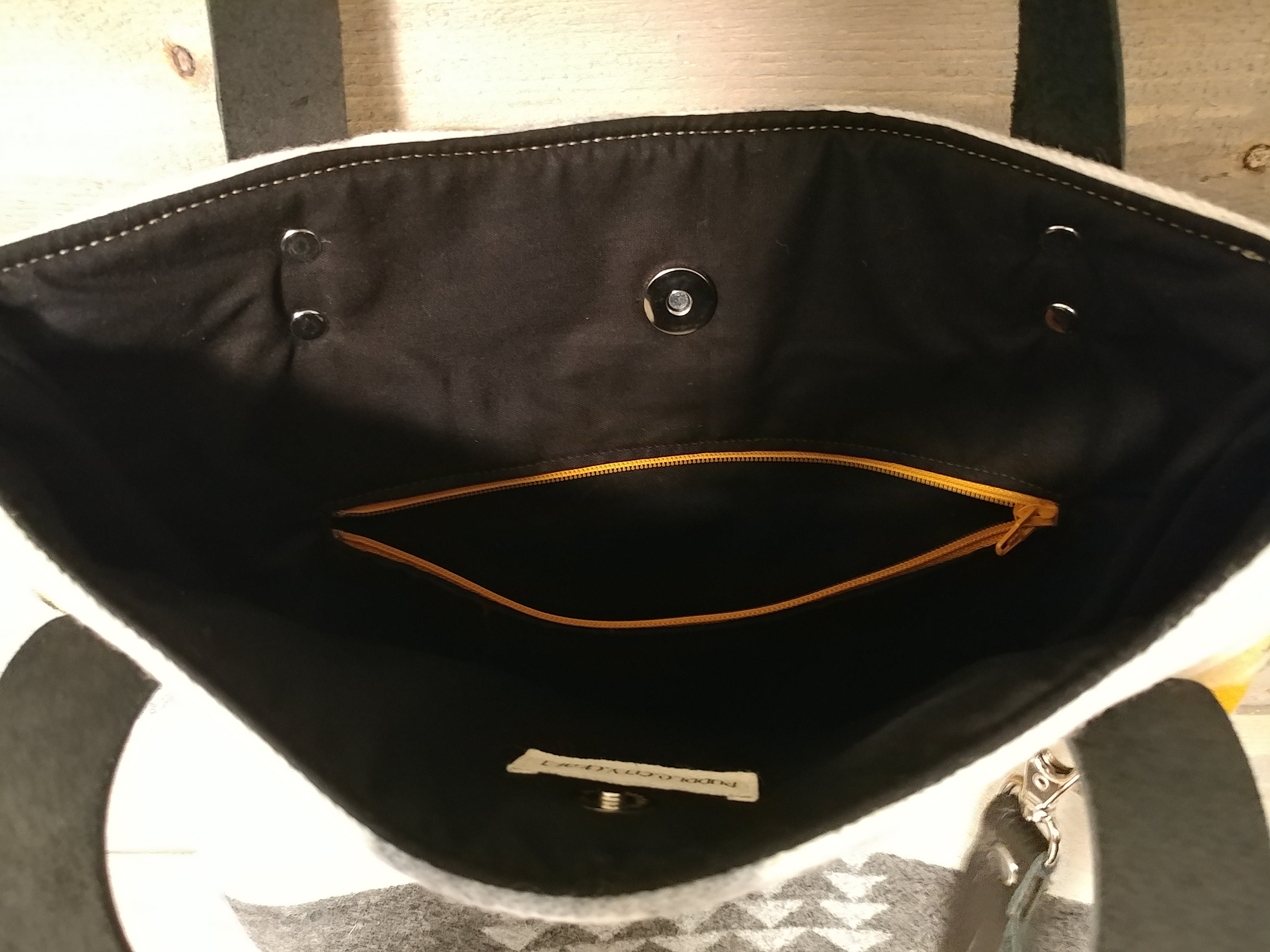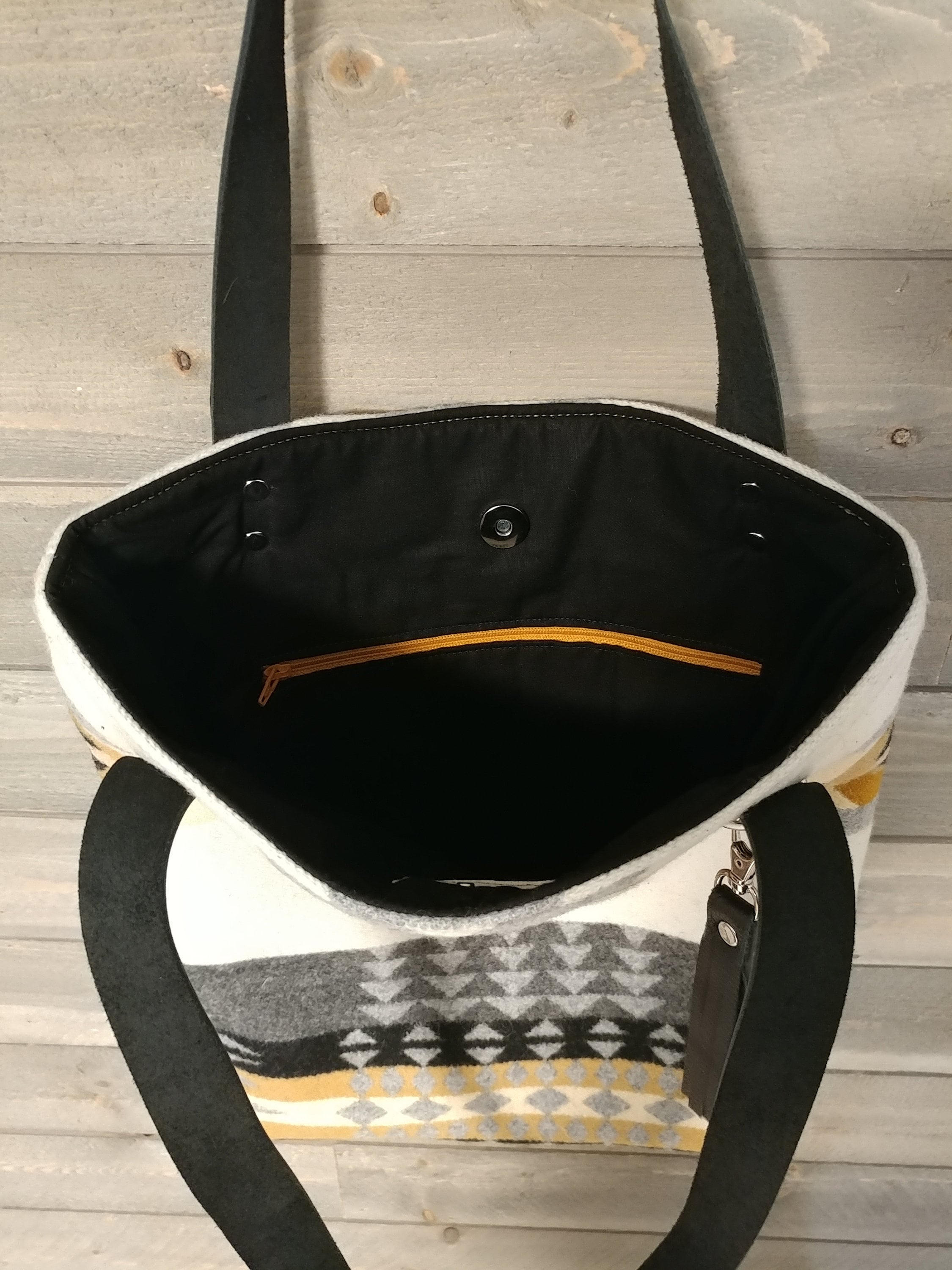 Pendleton print is a lovely gray/mustard mix. Black cotton lining with inside zip pocket and magnetic snap closure. Bag is nice and soft, easily collapsable/foldable to take traveling.